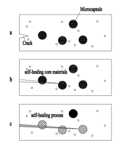Microcapsule technology is a technique that uses a healing agent as the core and a polymer as the shell to create core-shell structured microcapsules. This technology has been widely applied in the pharmaceutical, food, and printing industries. In the construction industry, adding microcapsules to concrete has a significant positive effect on maintaining its mechanical properties. Not only can it accurately locate defects within the cement matrix, but it also enables the automatic repair of microcracks. The process of microcapsule self-healing in concrete structures is illustrated in Figure6. When microcracks appear in the cement matrix, under the force exerted by the crack tips, the shell of the microcapsules ruptures, releasing the healing agent, which prevents internal microcracks from propagating further within the structure.