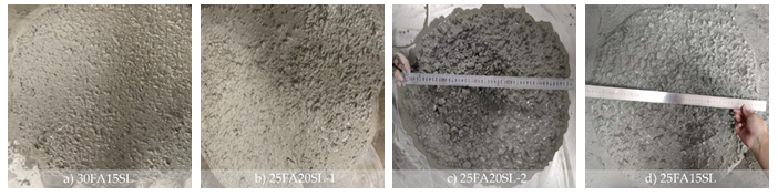In Group 7 (Group 25FA15SL) , a newly formulated water-reducing agent was used, which increased slump retention and air entrainment. Increasing the water content to 153 kg and reducing the sand ratio to 38% resulted in excellent workability, with no bleeding or bottom segregation. However, the water-binder ratio of 0.35 exceeded the requirements of the “Code for Durability Design of Concrete Structures in Highway Engineering” (JTG/T 3310-2019) , necessitating further optimization.