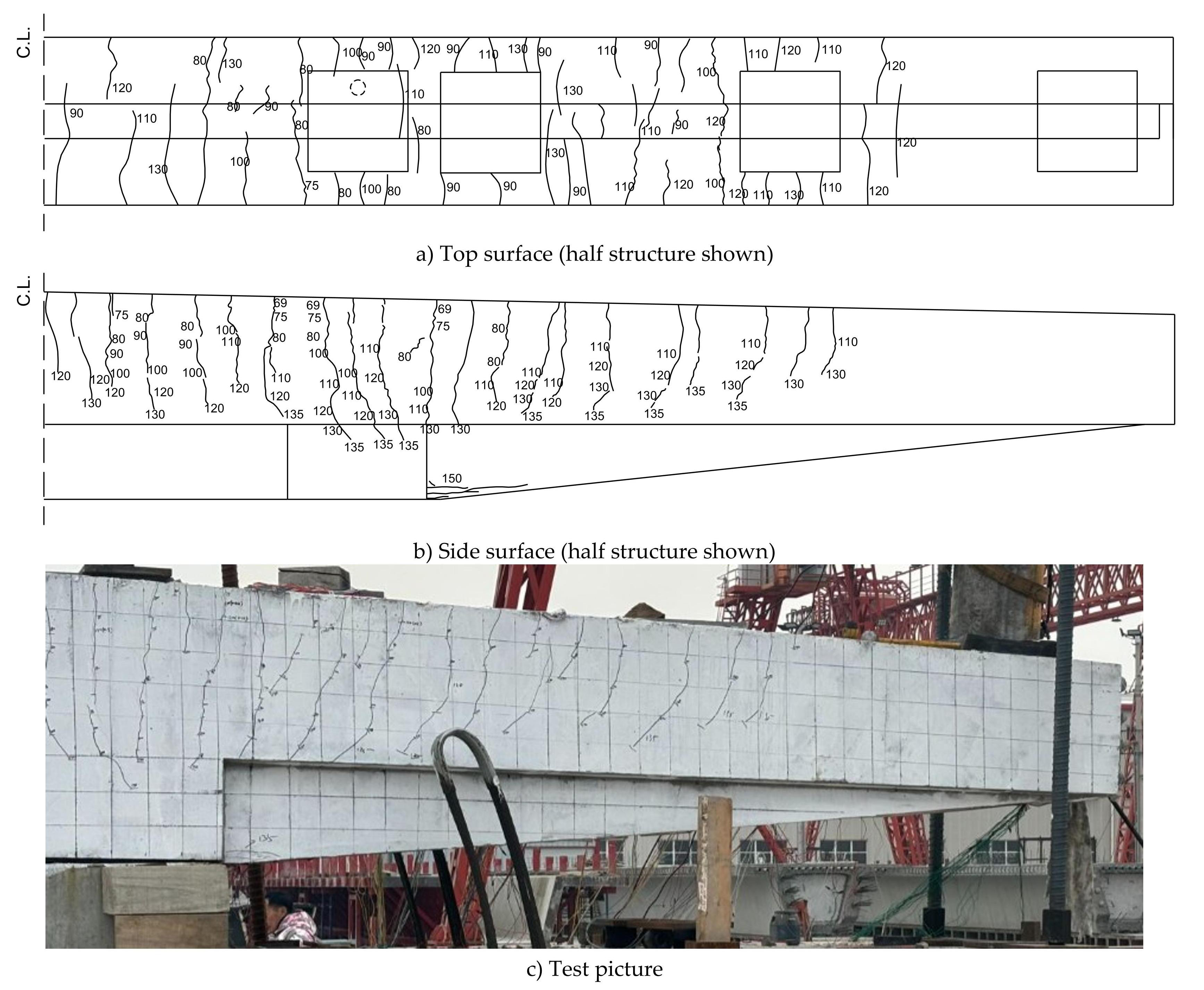 The test beam had similar failure characteristics in both cantilevers under symmetrical loading conditions. When the load was below 69 t, the beam remained in the elastic stage without visible cracks. Initial transverse through-cracks appeared at the top surface of both cantilever roots at 69 t, accompanied by noncontinuous transverse cracks in the midspan postcast strip.