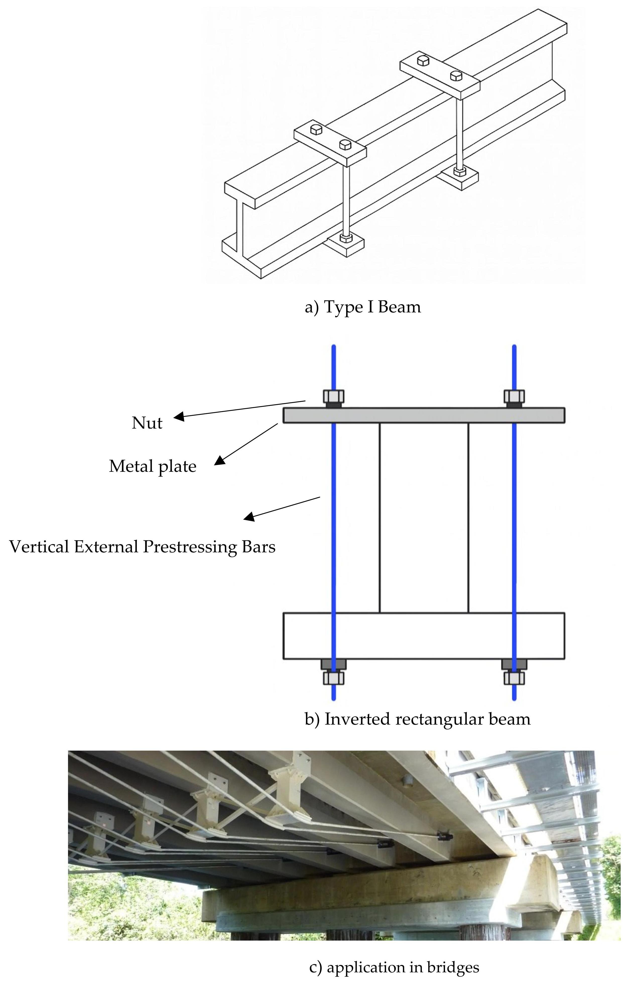 • External Vertical Prestressing Rebars (EVPRs) : These bars were installed vertically on the sides of the beam web by drilling pre-determined holes or slots in the concrete and inserting high-strength steel bars. The bars were then anchored at the top and bottom of the beam using steel plates, torque-controlled expansion anchors, or mechanical anchorages.