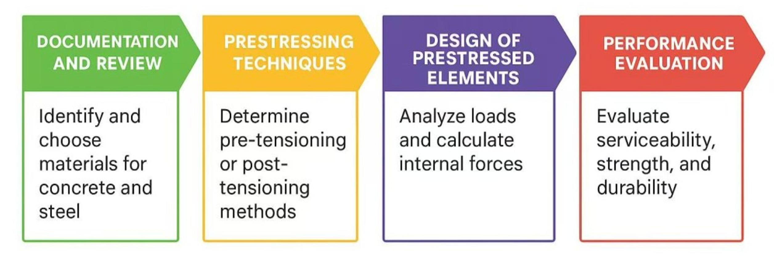 Despite its potential, the adoption of external prestressing for shear strengthening in design practice remains limited [18, 19]. Challenges persist in terms of optimizing system design, understanding interactions with existing reinforcements, and accurately modeling behavior through numerical methods [20-22]. To address these challenges, experimental testing has been combined with advanced numerical modeling, validating the hypothesis that external prestressing enhances shear resistance through active confinement and delays brittle failure modes [23-28]. The workflow for analyzing prestressed concrete, encompassing material selection, prestressing techniques, structural analysis, and performance evaluation, is illustrated in Figure2.