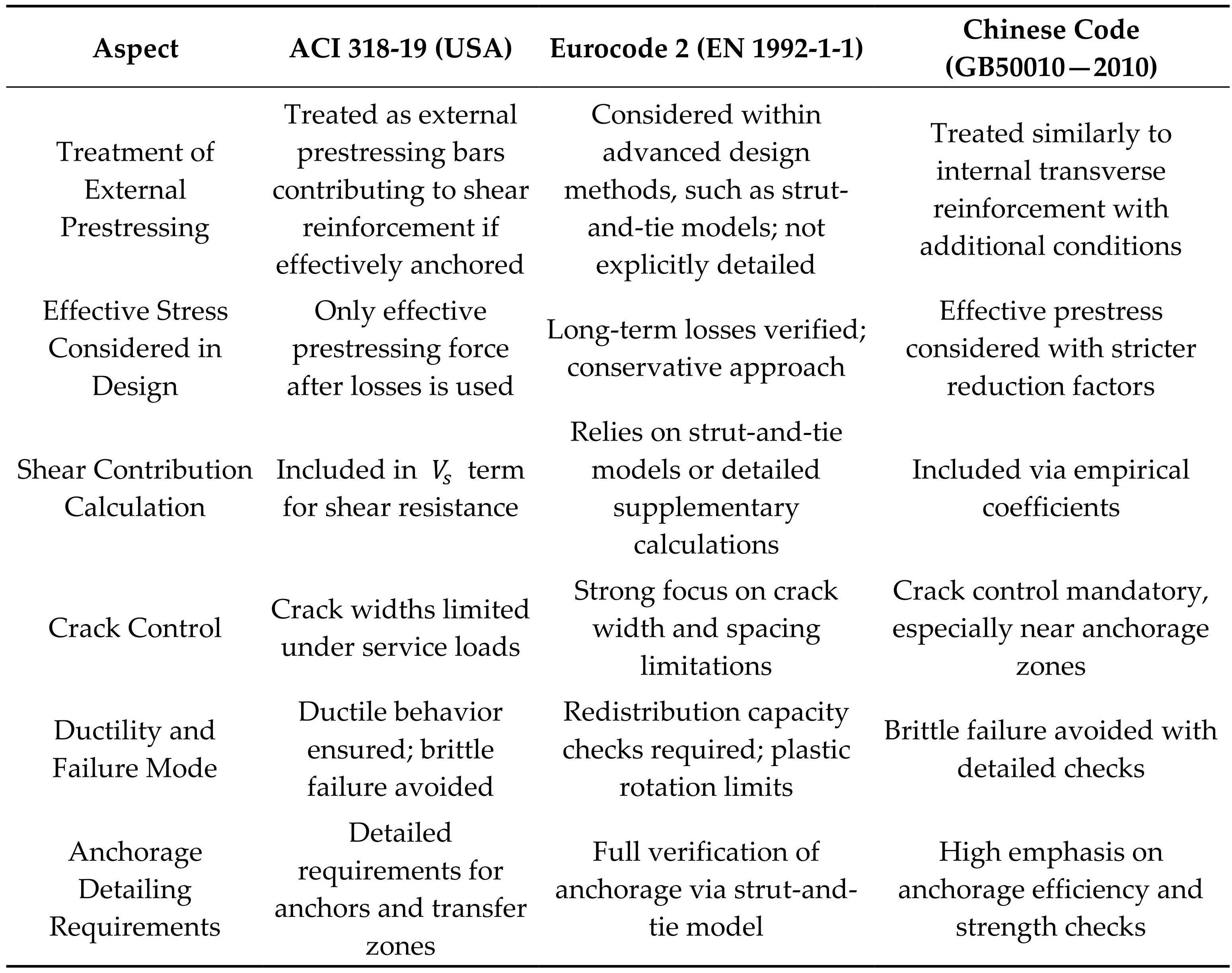 Table1 summarizes the incorporation of external prestressing in shear design varies across international codes. ACI 318-19 [38, 39] allows the inclusion of external prestressing as shear reinforcement when effectively anchored, whereas Eurocode2 [40] relies on strut-and-tie models, requiring rigorous analytical verification. The Chinese Code (GB50010-2010) [41, 42] adopts a conservative approach, in which stricter reduction factors are applied to account for long-term effects and anchorage performance. These differences reflect varying emphases on the mechanical principles of external prestressing, as detailed in Table1.