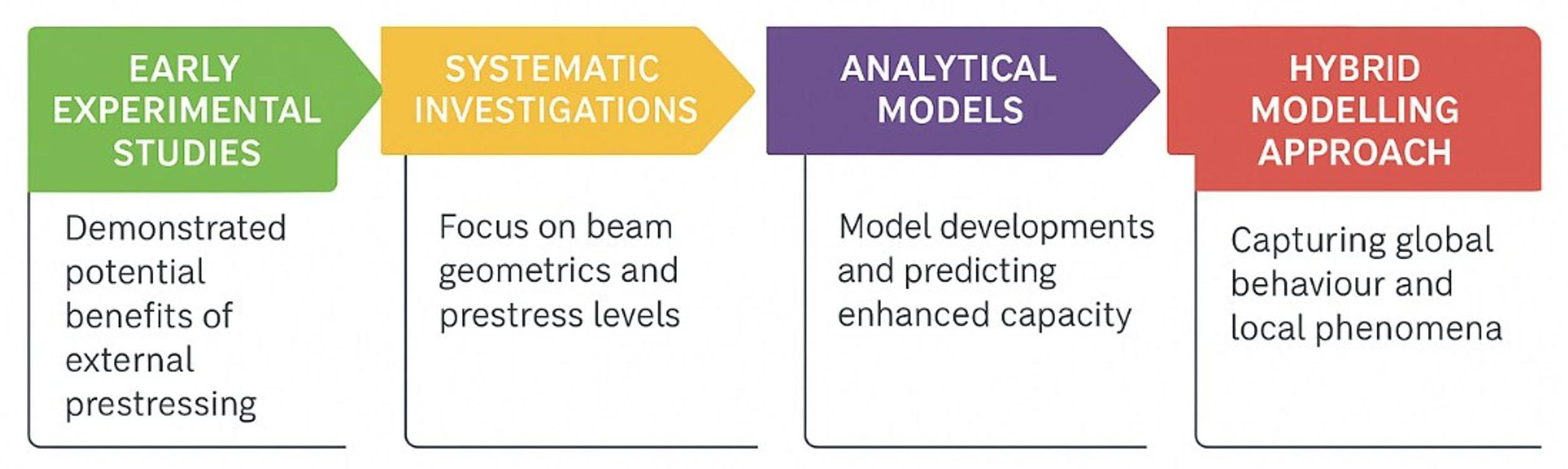 In summary, Figure3 illustrates the progression of investigative approaches, from early experimental studies to advanced hybrid modeling methods, highlighting the increasing sophistication in understanding and applying external prestressing for shear strengthening. :