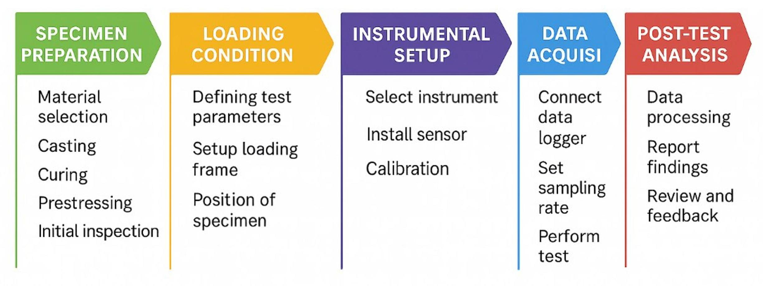This section outlines the methodology employed in experimental investigations of RC beams strengthened with external prestressing bars. Detailed descriptions of the specimen preparation, instrumentation, test setup, and procedures used to apply external prestress are provided. A detailed flowchart outlining the procedure for testing prestressed concrete, such as specimen preparation, loading conditions, instrumentation setup, and data acquisition, is shown in Figure4.