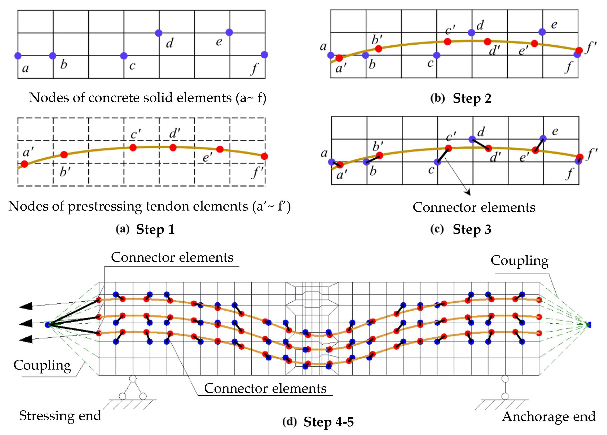 In the equation, the distance metric function is based on the Euclidean distance. Based on this principle, this study employs connector elements rapidly established via the nearest point matching algorithm to simulate the application of posttensioned prestress. Compared with nonlinear spring elements, connector elements offer greater ease of use and extensibility (such as when duct friction is defined) . As illustrated in Figure1, the specific implementation procedure is as follows: