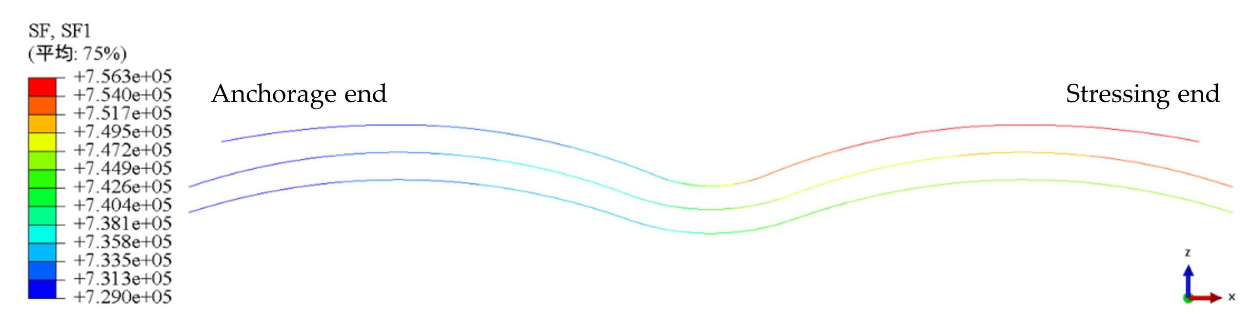 The axial force distribution contours of the cross-sections of the prestressing strands are shown in Figure7. The results indicate that the axial force in each strand gradually decreases from the stressing end to the anchorage end, which is consistent with the typical post-tensioning prestress distribution observed in actual engineering practice because of prestress losses, including friction losses, anchorage losses, and duct wall bearing effects [20].