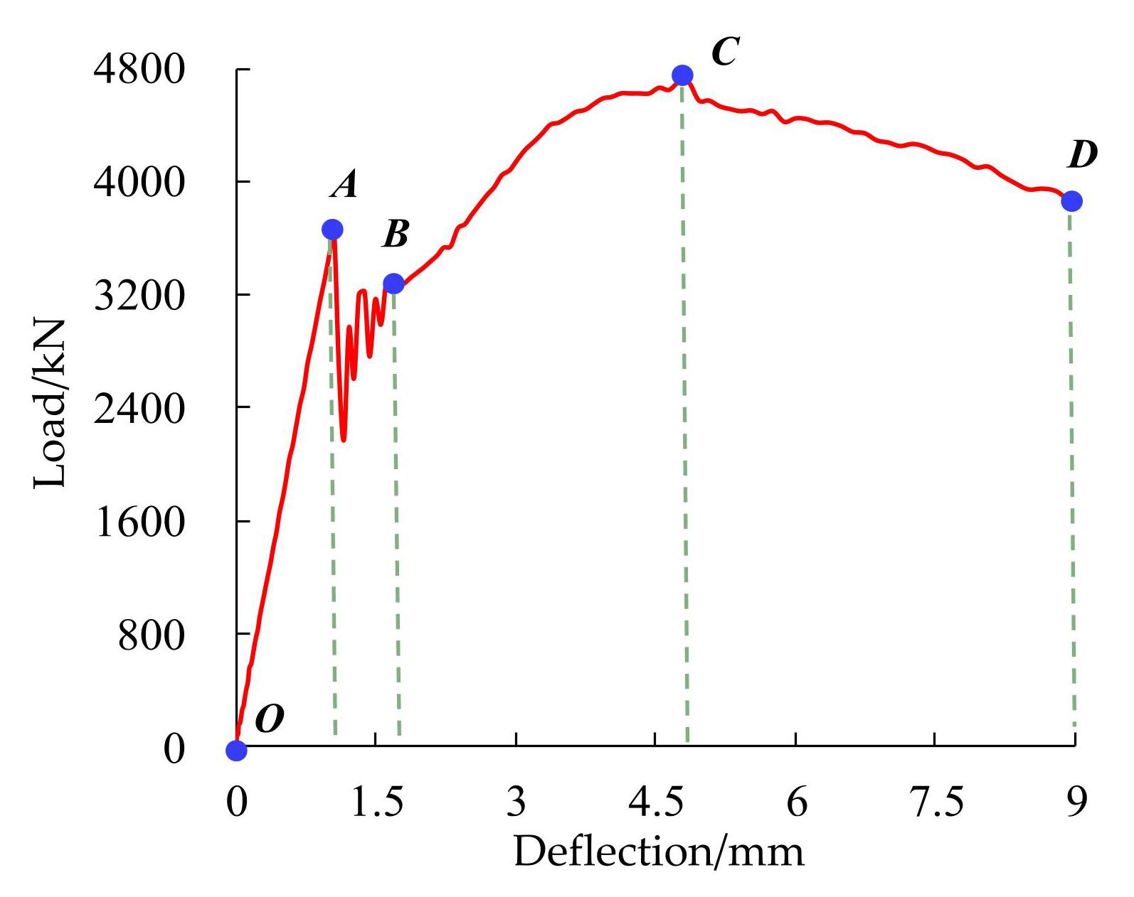 Elastic stage (segment OA) : The load-deflection curve is linear, with the concrete, reinforcement, and prestressing strands remaining in the elastic range. The beam demonstrates relatively high overall stiffness.