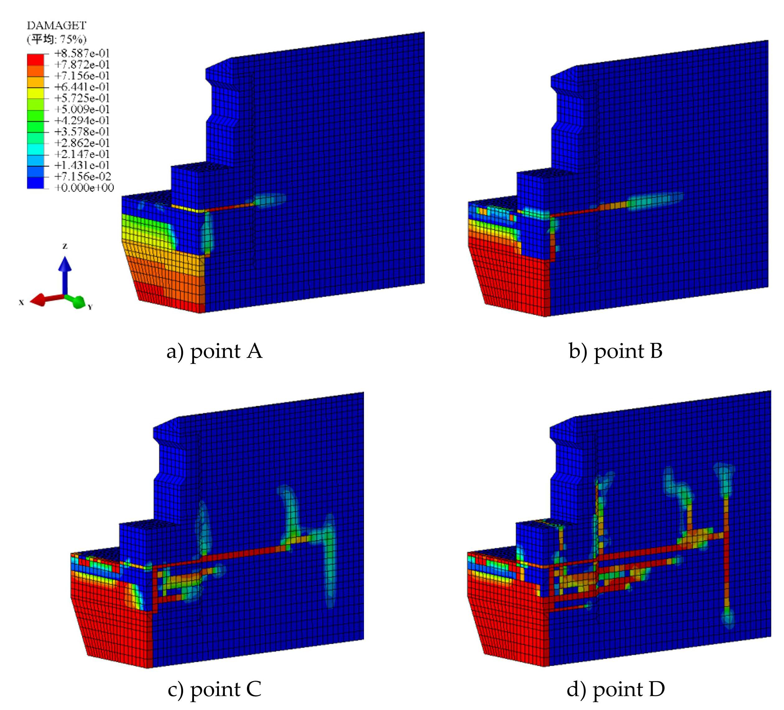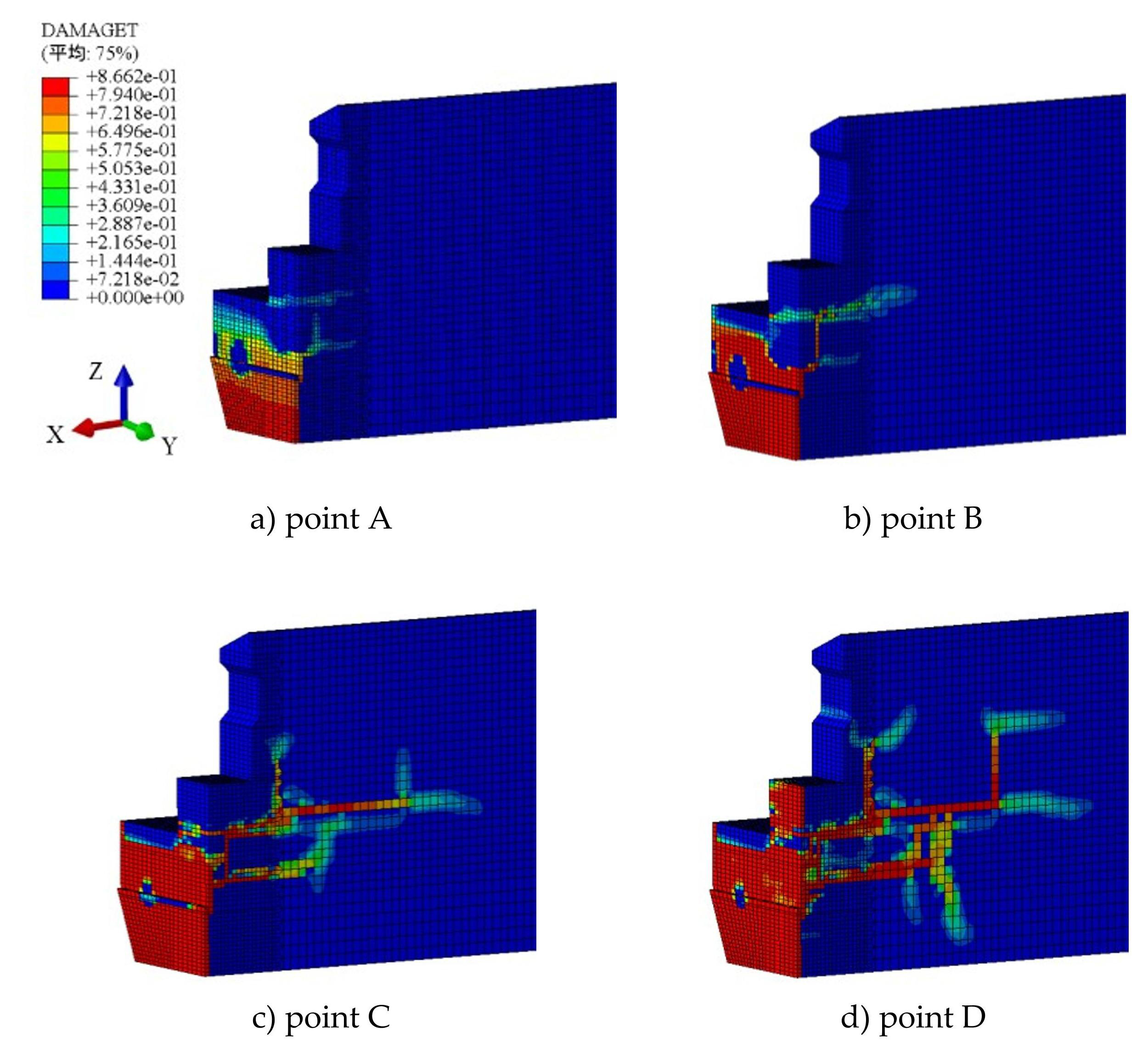 Cracking stage (segment AB) : upon reaching point A, vertical cracks first appear at the bottom of the concrete near the mid-span adhesive joint, whereas progressive damage initiates from the root of the bottom shear keys in an upward direction. The damage contour of the beam segment at this stage is shown in Figure10 a) . As the load continues to increase, the plastic zone around the mid-span adhesive joint gradually expands, resulting in noticeable nonlinear fluctuations in the load-deflection curve.