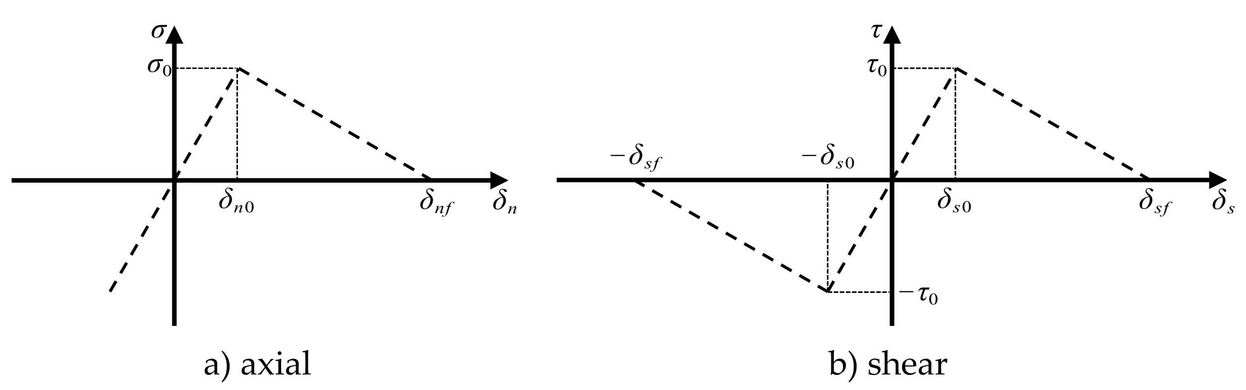 To address the issues, this study adopts a fracture mechanics-based cohesive contact element to simulate the mechanical behavior of the adhesive interface. This element incorporates damage criteria to represent the progressive failure process of the adhesive joint. The adhesive material is modeled using a bilinear constitutive law based on the Park-Paulino-Roesler (PPR) energy criterion, which defines tensile-shear coupled failure behavior through critical fracture energy and interface displacements. The uniaxial stress-displacement response is illustrated in Figure2: During the elastic phase, stress increases linearly with displacement; in the softening phase, stress decreases linearly with damage accumulation to zero, dissipating all the energy. Here, 𝜎 and 𝜏 denote the normal and shear stresses, respectively; 𝜎 0 and 𝜏 0 are the normal and shear strength limits, respectively; 𝛿 𝑛 and 𝛿 𝑠 represent the normal and shear displacements, respectively; 𝛿 𝑛 0 and 𝛿 𝑠 0 are the initial damage displacements; and 𝛿 𝑛 𝑓 and 𝛿 𝑠 𝑓 are the failure displacements. This constitutive model assumes the elastic response of the adhesive interface under normal compression and considers failure only under tension and shear, which is consistent with the actual behavior of adhesive joints [16-17].