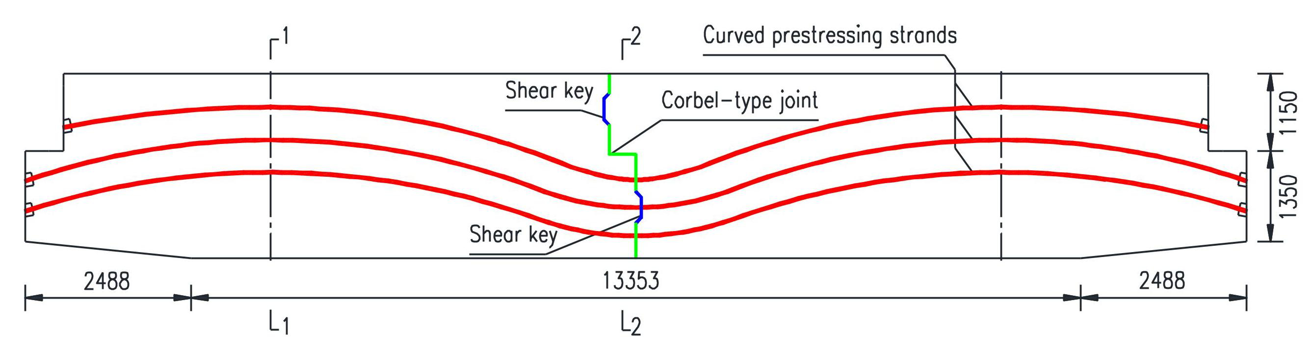 This study is based on the second phase of the Changzhang Expressway reconstruction and expansion project, in which a novel post-tensioned segmental precast cap beam is designed to accelerate construction and improve project quality. The member adopts an inverted T-shaped cross-section. The two precast beam segments are connected along the mid-span section through a combination of “corbel-type” joints and shear keys, with adhesive joints applied at the connection interfaces.