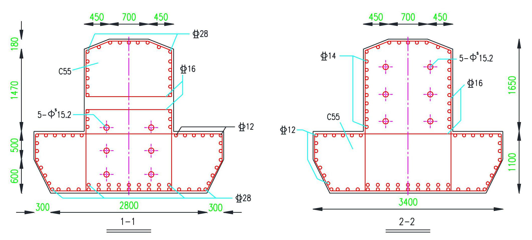 Figure4 Cross-sectional details of the cap beam at the end (Section 1-1) and mid (Section 2-2) spans (unit: mm)