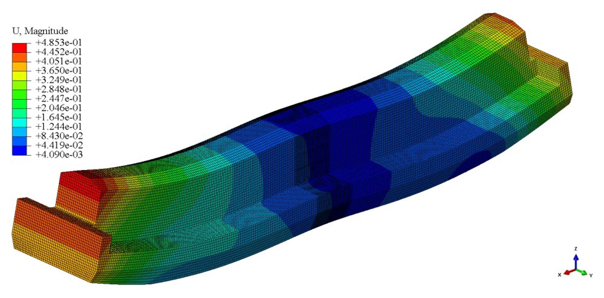 To validate the rationality of the proposed modeling method, prestressing was applied to the beam, with the negative x-direction defined as the anchorage end and the positive x-direction as the stressing end. The displacement contours of the concrete beam segment after the application of prestressing are shown in Figure6. The beam exhibited the expected camber during the stressing process, with the camber shape corresponding well to the geometry of the curved prestressing tendons. These findings preliminarily confirm the effectiveness of the proposed numerical modeling approach for post-tensioned prestressing.
