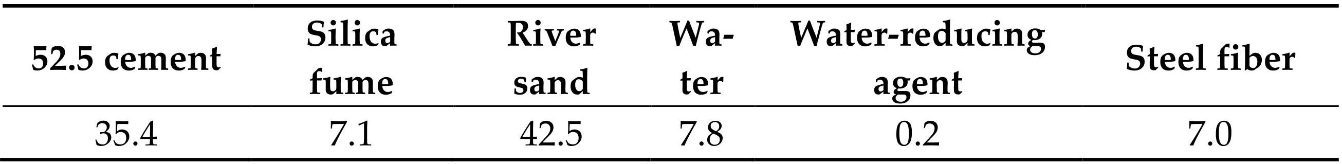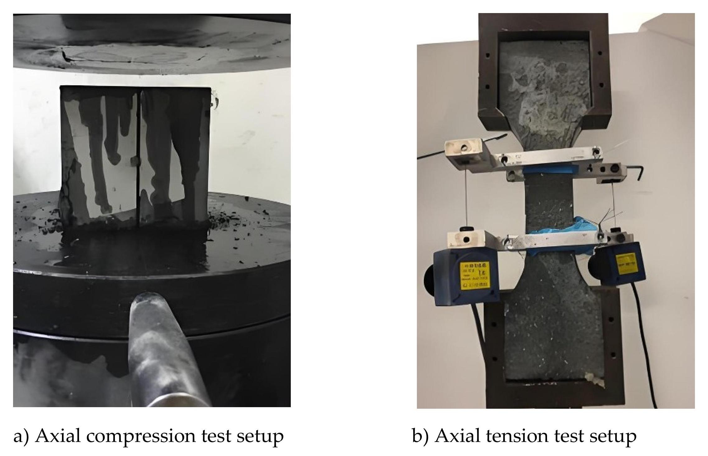 The mix proportion of the UHPC material used in this test is shown in Table1. The main materials include P∙O 52.5 cement, silica fume, river sand, water, copper-coated straight steel fibers (12 mm in length and 0.2 mm in diameter) , and polycarboxylate superplasticizer. Axial compression and axial tension tests were conducted on the samples. The 28-day axial tensile strength ranged from 6.5 to 7.5 MPa, while the28-day axial compressive strength was approximately 150 MPa. HRB335-grade ribbed steel bars with an average yield strain of about 2300 𝜇 𝜀 were used as the embedded reinforcement. The test setup for evaluating the axial compression and tensile properties of the UHPC material is illustrated in Figure1.