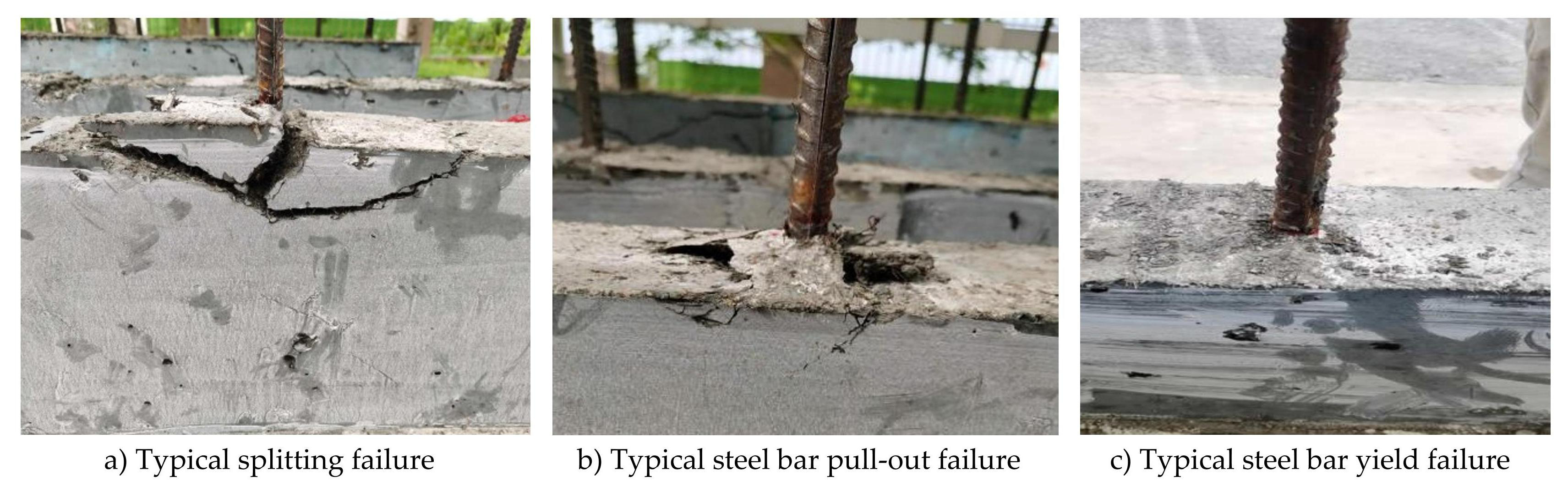 The typical bond failure modes between steel bars and concrete can be categorized into three main types: steel bar pull-out failure, steel bar yield failure, and concrete splitting failure. The failure modes of the ribbed steel bar-UHPC pullout samples tested in this study are summarized in Table3 below.