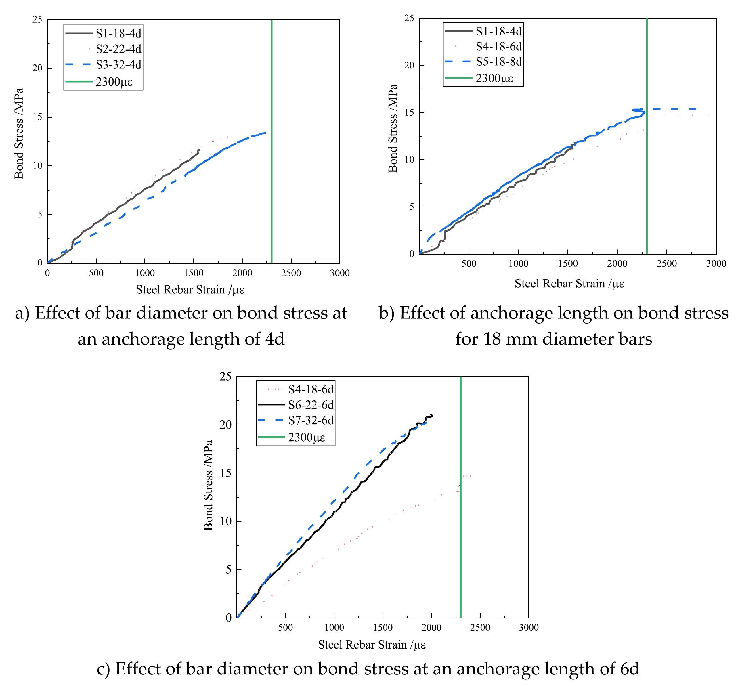 The average bond stress‒maximum steel bar tensile strain curves for each sample are shown in Figure8. The green vertical lines in Figure8 represent the steel bar yield strain reference lines. As shown in the curve in Figure8 a) , when the bond length was small (4d) and the steel bar diameter is large, samples S1, S2, and S3 primarily experienced steel bar pull-out failure and UHPC splitting failure. At this point, the tensile strength of the steel bar was not fully utilized, resulting in relatively low average bond stresses; thus, no steel bar yield failure occurred.