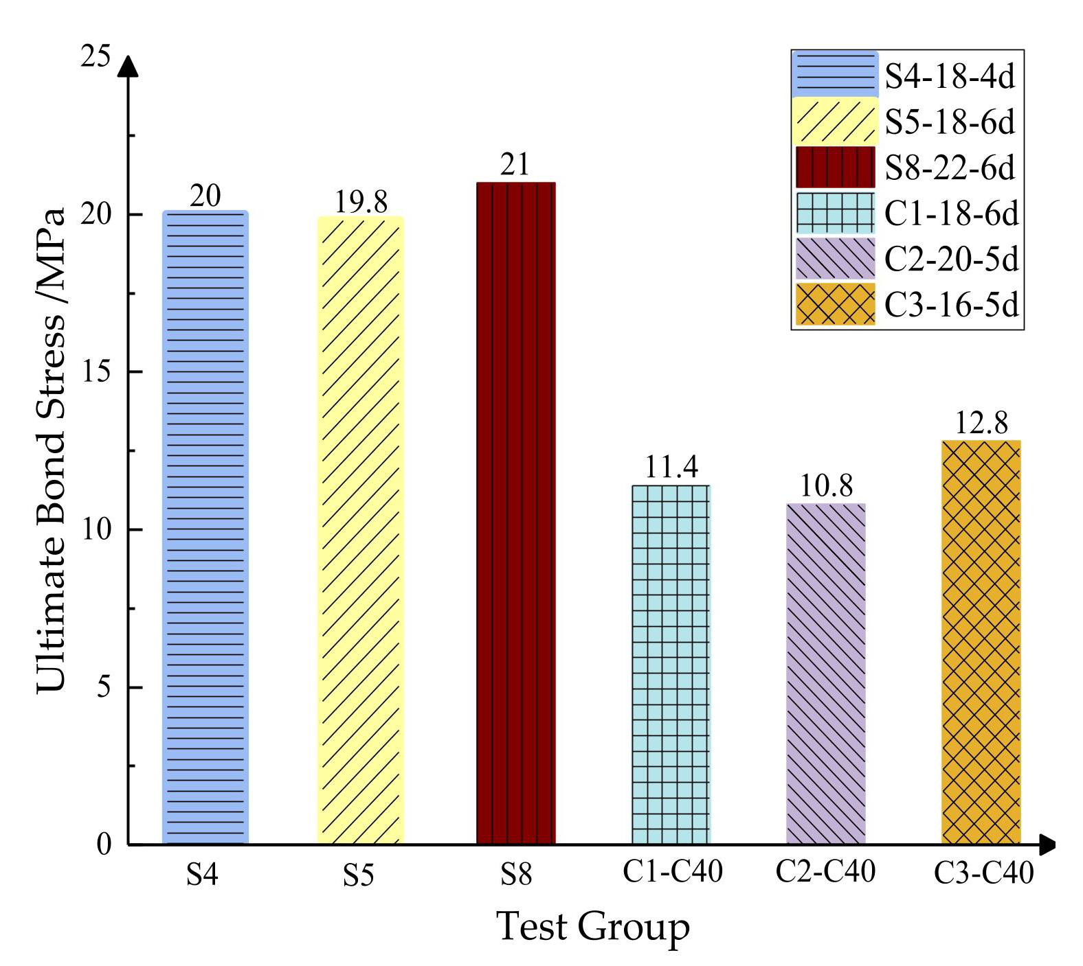 When the bond length was 4d for all samples, the bond stress‒slip curves of Samples S1 (d = 18 mm) , Samples S2 (d = 22 mm) , and Samples S3 (d = 32 mm) showed similar trends. The ultimate bond strength of Sample S2 was 10.11% greater than that of Sample S1. Sample S3 (d = 32 mm) failed due to splitting and did not reach the ultimate bond strength; however, its ultimate bond strength was still3.1% higher than that of S2. When the bond length was 6d, the ultimate bond stress of Sample S4 (d = 18 mm) was 19.03 MPa, and the maximum bond stress of Sample S6 (d = 22 mm) was 21.18 MPa, representing an increase of 11.3% compared with the former. The sample experienced splitting failure. S7 (d = 32 mm) also experienced splitting failure earlier due to insufficient protective layer thickness, with an ultimate bond stress of 21.08 MPa, and failed to fully utilize the advantage of a larger bond interface area.From the above analysis, it can be concluded that under the same bond length and protective layer thickness and with sufficient protective layer thickness, the bond strength can significantly increase as the steel bar diameter increases. When the anchorage length increased from 4 d to 8 d, the failure mode of samples transitioned from pull-out failure to reinforcement yielding, with the maximum bond stress increasing from 11.82 MPa to 19.85 MPa, representing an increase of approximately 67.94%. Increasing the anchorage length did not affect the bond failure strength of the samples.