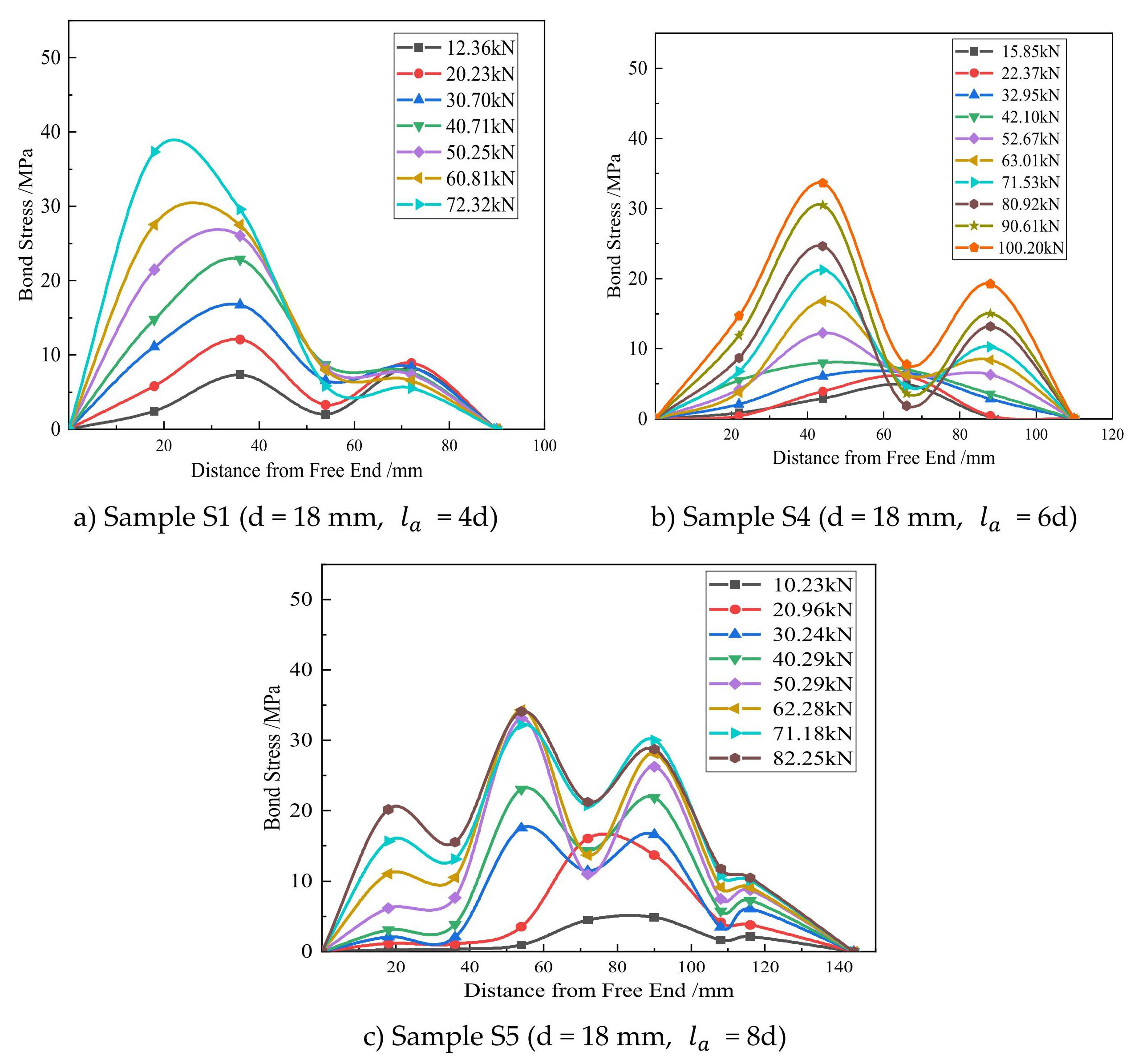 To compare the changes in bond stress distribution during the process of bond strength transition from zero to maximum bond strength, three pull-out samples (S1, S4, and S5) with a steel bar diameter of 18 mm that experienced pull-out failure or steel bar yielding were selected for analysis of the bond stress distribution in the bonded section. The measured bond strength‒distance-from-free-end relationship curves for samples S1, S4, and S5 are shown in Figure12. At low loads (approximately 10 kN) , the bond stress distribution was relatively uniform, with the peak bond stress occurring near the loading end. As the load increased, the peak bond stress tended to shift toward the free end, whereas the bond stress distribution within the bonded section became increasingly nonuniform. The distribution characteristics of the bond stress are related to bond length. As the bond length increased, the bond stress distribution within the bonded section tended to exhibit a multipeak characteristic. When the bond length increased from 4d to 8d, the degree of non-uniformity in the bond stress within the bonded section increased, and the number of bond stress peaks increased from 2 to 3.