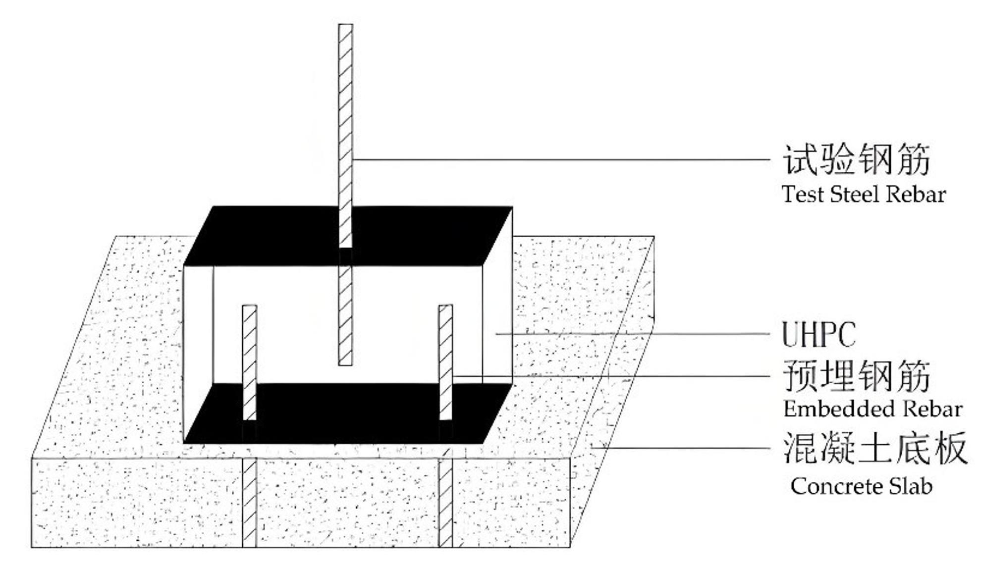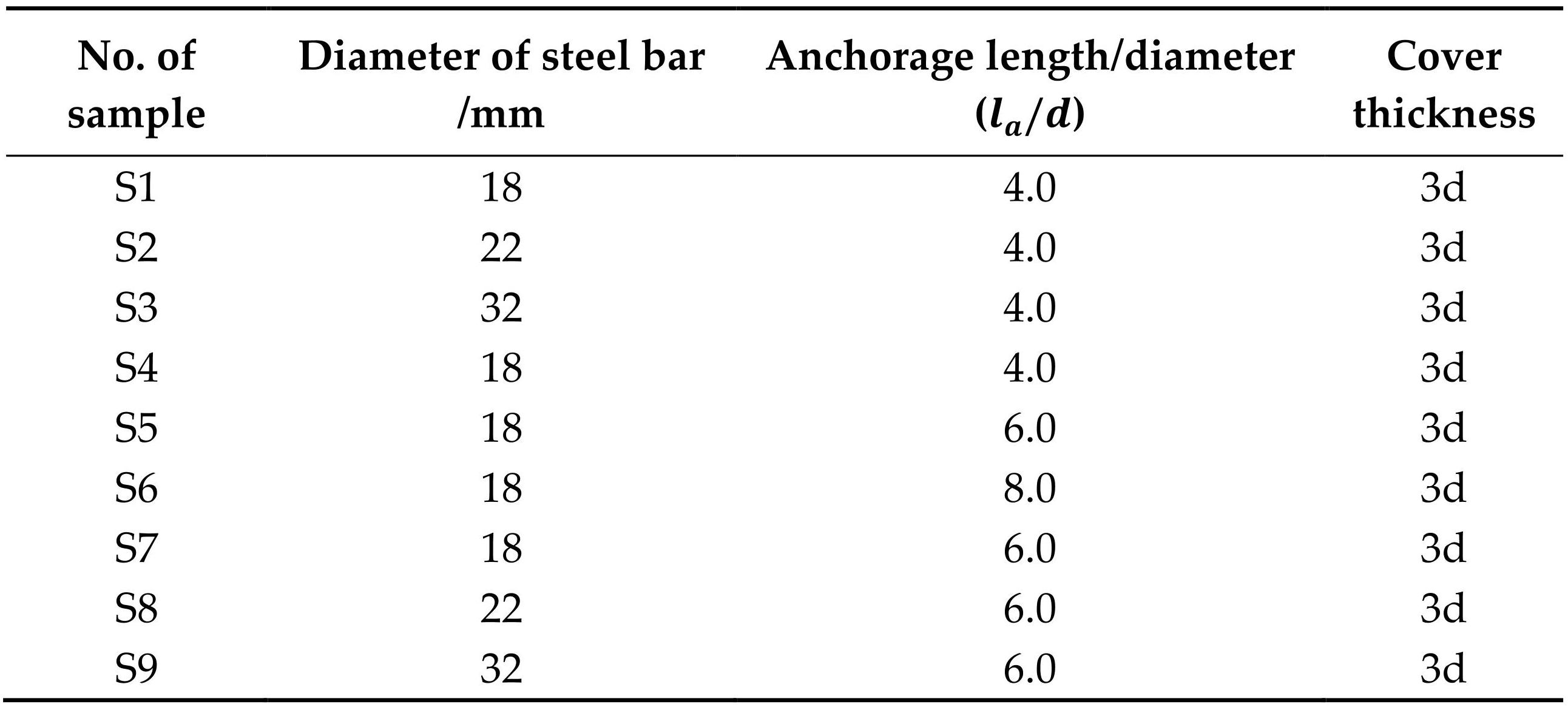 Note: The diameter of the steel bar was selected based on commonly used values in bridge engineering. The anchorage length was determined with reference to the research findings of [28], specifically to achieve two failure modes (pull-out failure and matrix failure) and to investigate the designed anchorage length of ribbed steel bar.
