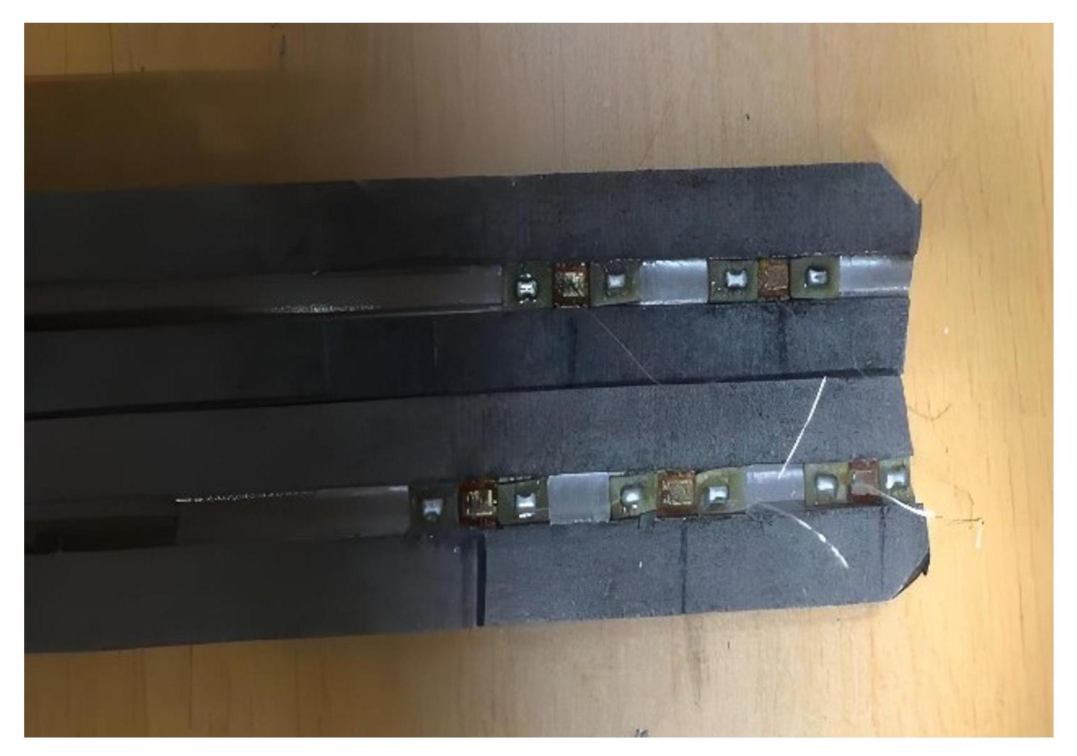 To obtain the strain distribution of the ribbed steel bar along the bonded segment during the central pull-out tests, strain gauges were internally installed after pre-milling grooves on the bar. The procedure involved first splitting the steel bar symmetrically along its central axis. Each half-bar was milled with a groove measuring4 mm × 2 mm (width × depth) . After reassembling the two halves, the combined groove formed a4 mm × 4 mm cross-section. Strain gauges were uniformly distributed along the bonded segment of the specimen with a spacing of one steel bar diameter. The configuration of the strain gauges attached to the steel bar surface is shown in Figure3 below.