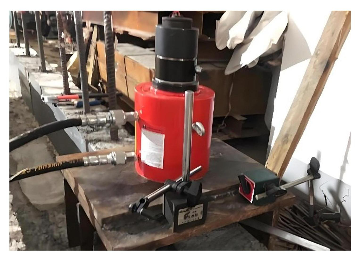 The test setup is shown in Figure4 below. First, a hydraulic jack was positioned on a custom-designed steel frame, which was supported by a pre-cast reinforced concrete slab. The tensile and compressive strength as well as the deformation of the steel frame had been pre-verified through calculations. Steel bars of different diameters were equipped with matching clamps at the free end. The loading assembly is illustrated in Figure5. The pull-out force was applied under force control throughout the test, with a loading rate of 100 N/s. The pulled steel bar remained in tension during the entire process. The test ended when either sample failure occurred or the load could no longer be increased.