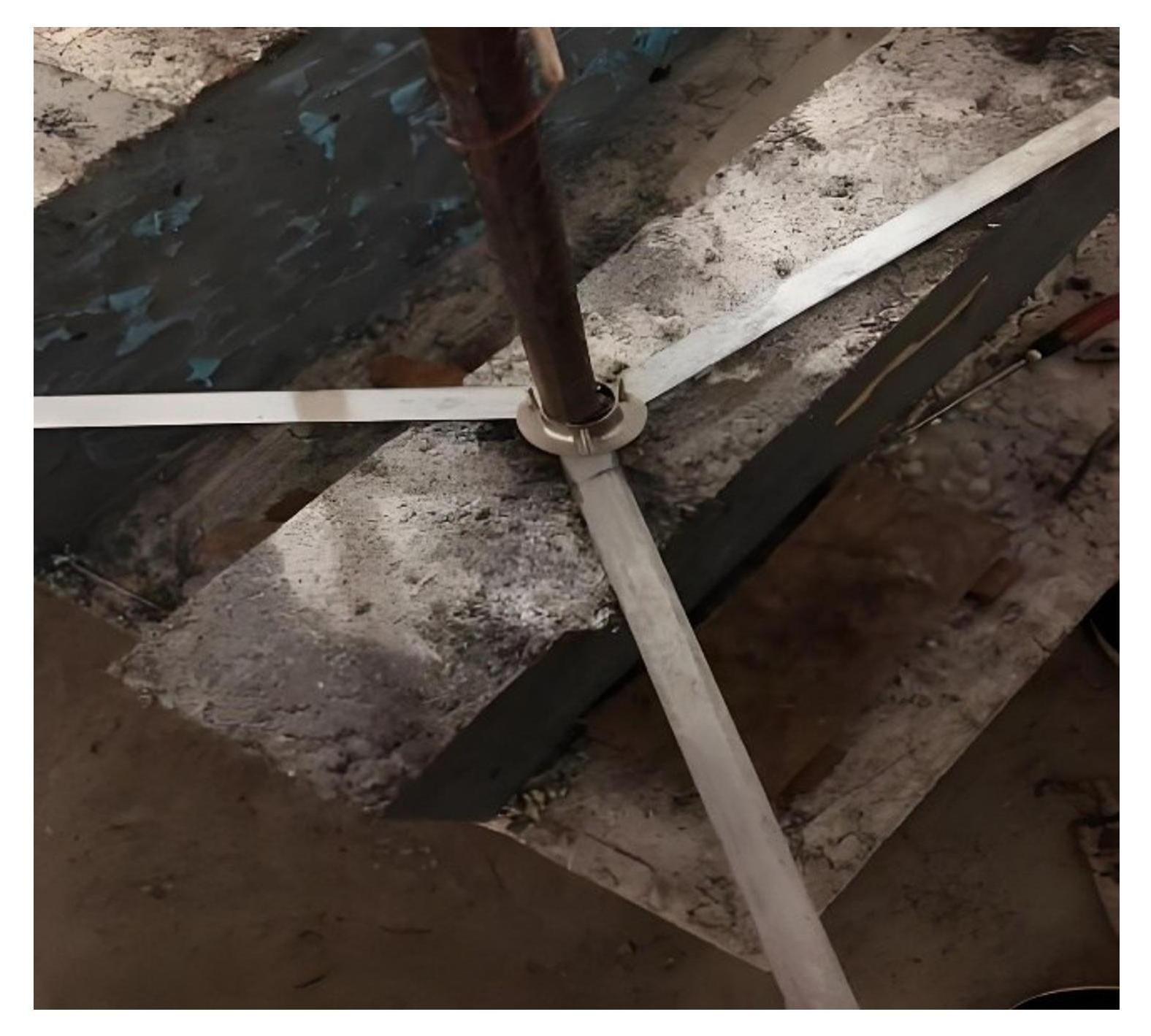 A force sensor between the jack and the steel bar clamp was used to monitor the pull-out force. Three displacement sensor holders fixed at 120° intervals were mounted at the end of the steel bar sample to measure the pull-out displacement, with the fixed bracket for the displacement sensors shown in Figure6 below. Data from both the force sensor and displacement sensors were collected and recorded using a DH3818 data acquisition system.