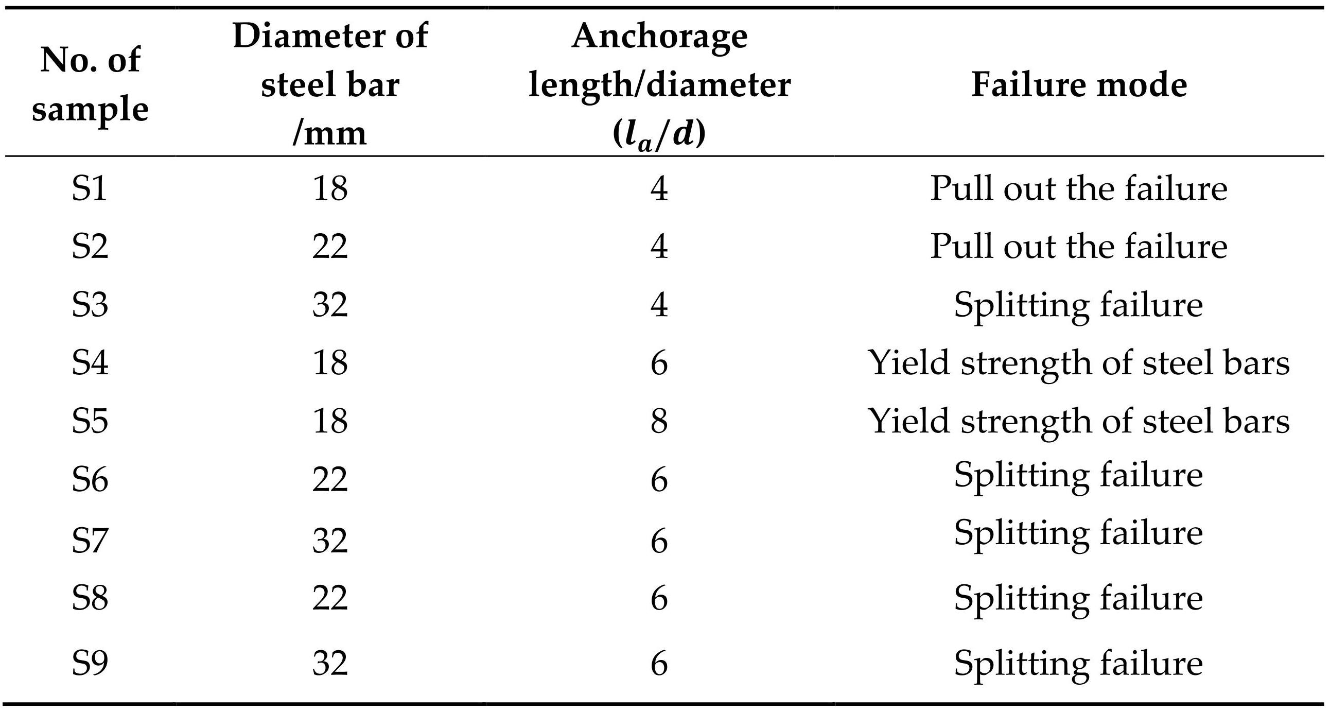 For samples S4 and S5, owing to their small steel bar diameters, both experienced steel bar yield failure when the anchorage length was large. No obvious cracks were observed on the sample surfaces, as shown in Figure7 c) .
