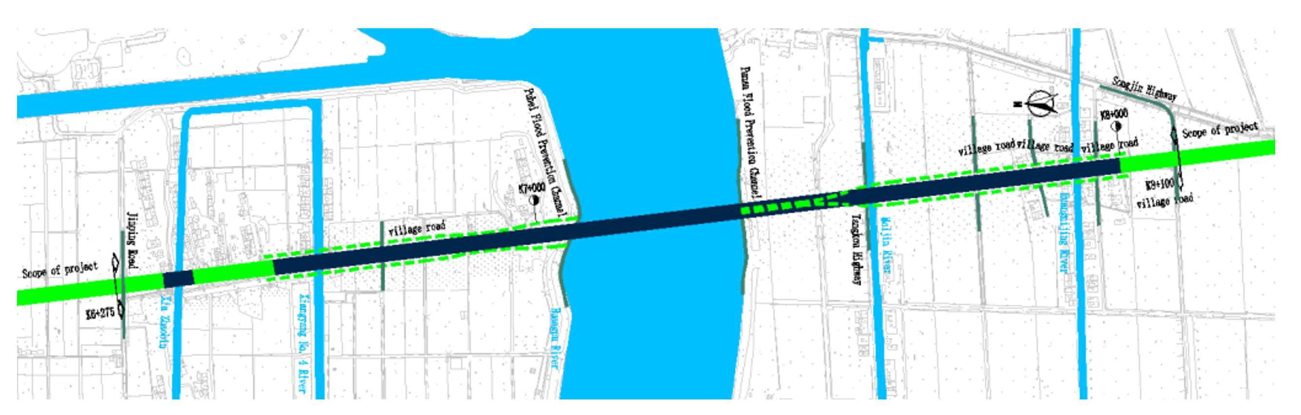 The Jiasong Highway Bridge over the Huangpu River is located in the Songjiang District, Shanghai, and is the planned Songpu Fourth Bridge, which will extend southward from the Jiasong Highway and cross the Huangpu River. The planned road classification for the new cross-river bridge of the Jiasong Highway project is a secondary highway [1]. It starts at Jinping Road in the north and ends at Songjin Highway in the south, with a total length of 1, 825 m and a red line width of 40 m/50 m, as shown in Figure1.