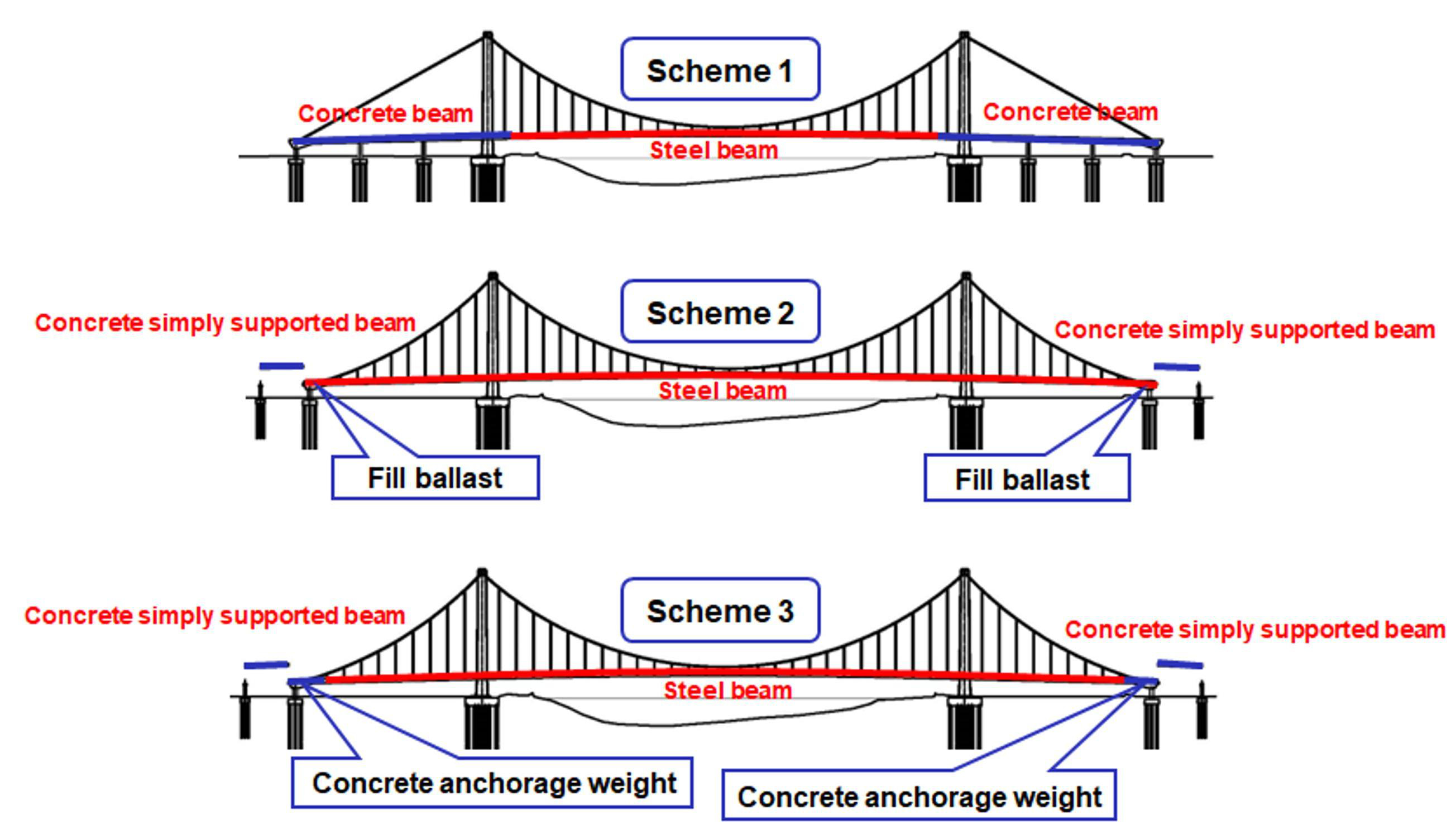 Since the main cables of a self-anchored suspension bridge are anchored to the beam, significant uplift forces inevitably occur at the beam ends, resulting in negative reactions (uplift forces) at the side pier supports. To address this issue, three common solutions are typically employed (see Figure10) :