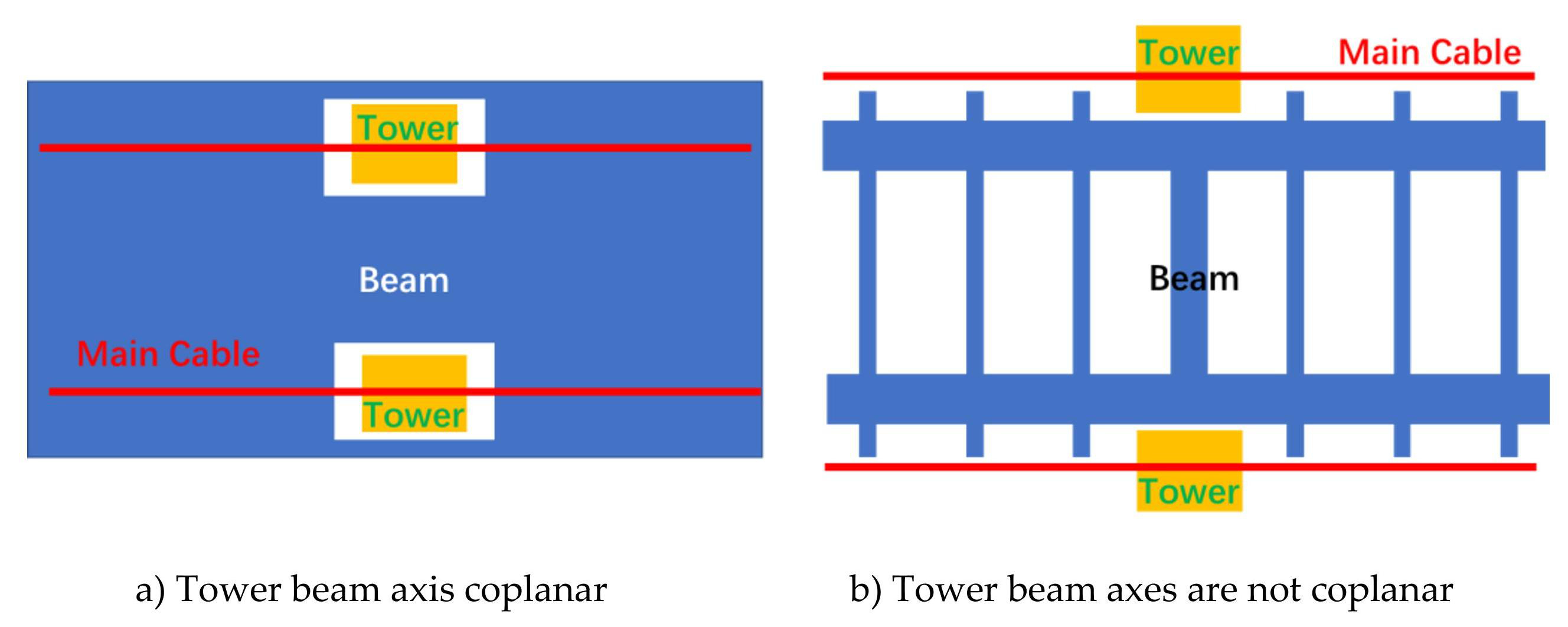 When the main tower is vertical and the cable plane is aligned with the centroidal axis of the beam, the following two typical positional relationships between the tower and the beam are commonly observed in self-anchored suspension bridges, as illustrated in Figure11.