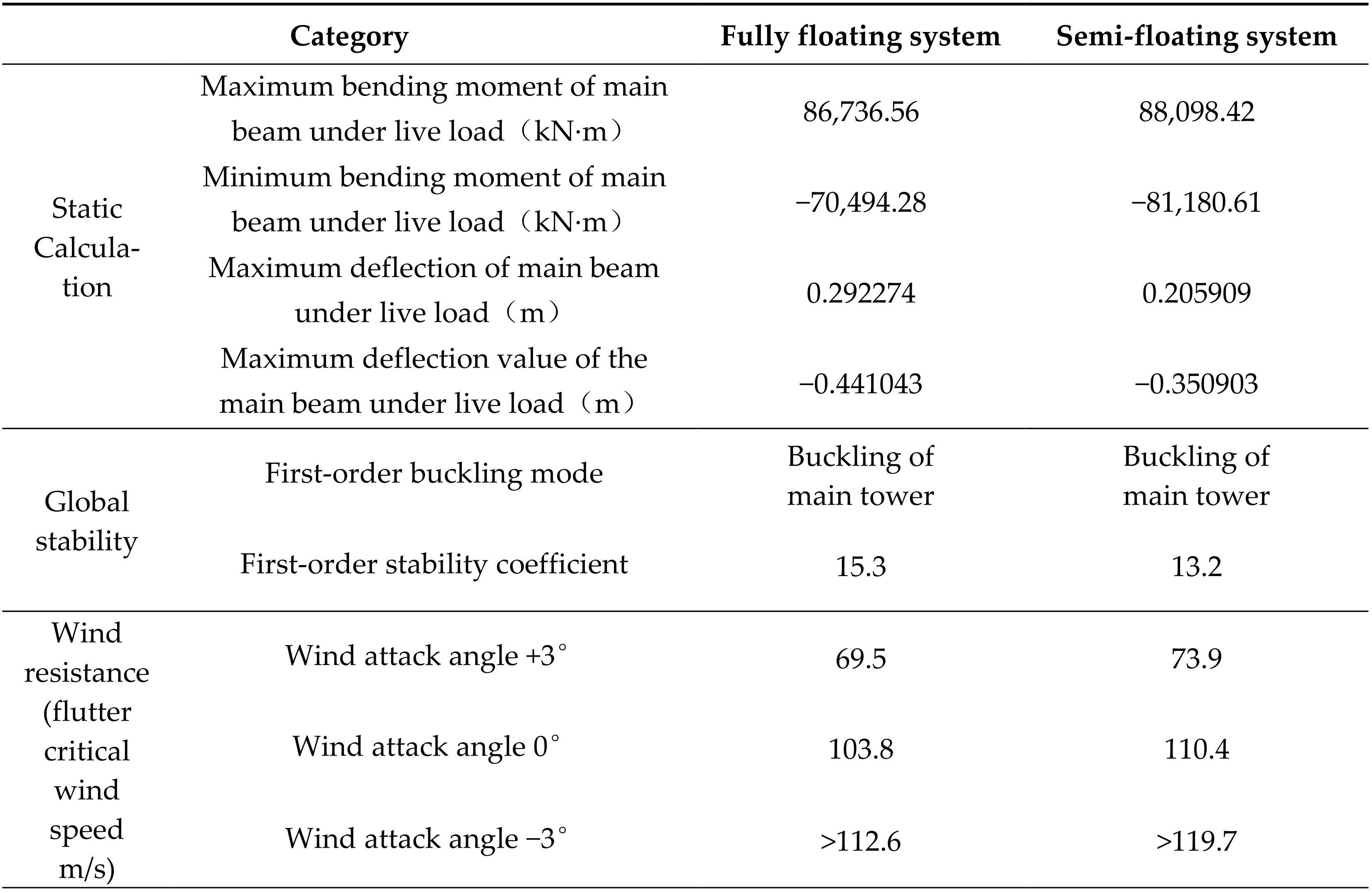 Considering the results of static calculations, wind resistance performance, and seismic performance, the installation of vertical bearings can improve the wind resistance performance of the stiffened girder and slightly improve its seismic performance. Therefore, a semi-floating system was ultimately adopted, with vertical bearings installed at the junction of the tower and beam.