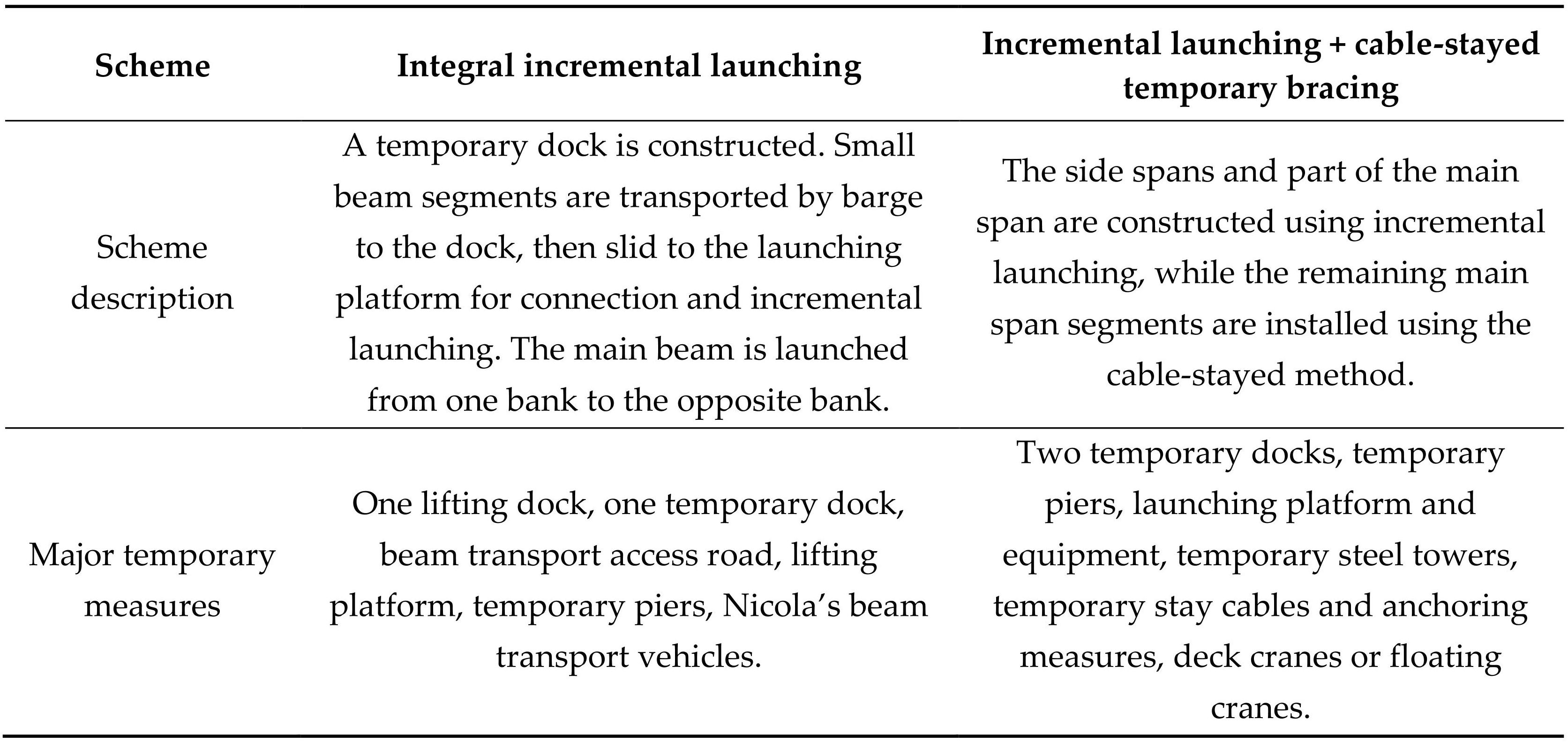 Based on the characteristics of this bridge, two construction schemes can be adopted for the main beam: (1) Integral incremental launching scheme; (2) Incremental launching + cable-stayed temporary bracing scheme [10-12]. A comparison of different construction schemes is shown in Table4.