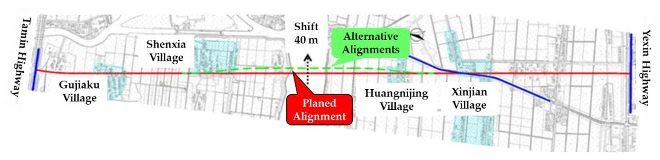 The selection of the bridge alignment should be comprehensively evaluated based on economic efficiency, implementability, and site conditions. This project compared two alternative alignments (Figure2) . The planned alignment follows a slightly southeast straight line from TaMin Road, crossing the Huangpu River and connecting to Yexin Highway. It is approximately 4.5 km in straight-line distance from the Chenta Road Bridge over Hengliaojing upstream and about 2.9 km from the Songpu Third Bridge on Songwei Highway. The spatial distribution of these three bridges is considered appropriate, and the planned alignment avoids the sharp rightangle bend of the Huangpu River. Considering advantages such as minimal relocation requirements, excellent road alignment, and relatively low implementation difficulty, this alignment was ultimately selected as the planned scheme.