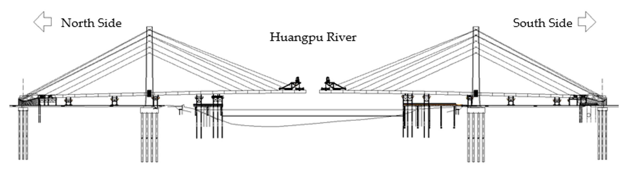 After comprehensive consideration of factors such as feasibility, impact on navigation, economic efficiency, construction maturity, and technical difficulty, the scheme combining incremental launching for side spans and cable-stayed temporary bracing for the main span (Figure12) has been adopted.
