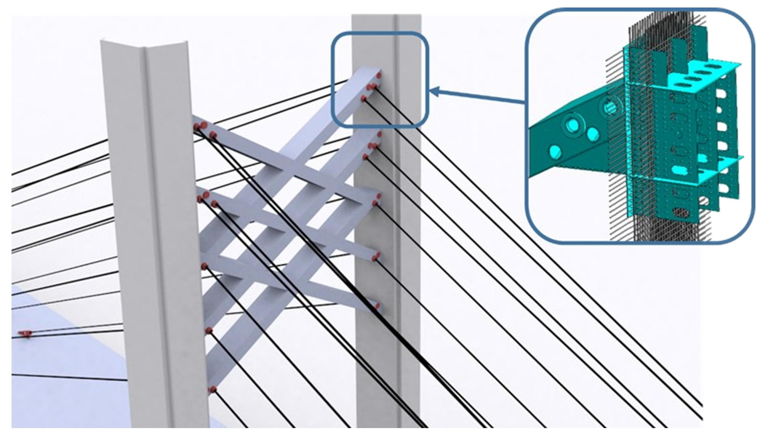 In this design scheme, the cables, towers, and beams are coplanar, as mentioned earlier, which does not impose additional forces on the structure, making it the best option in terms of load-bearing performance. However, considering the construction process, the middle and upper tower columns can be poured only after the main beams are installed, resulting in a longer construction period. Both the Nanchang Hongdu Bridge and the Fuzhou Luozhou Bridge adopted this scheme.
