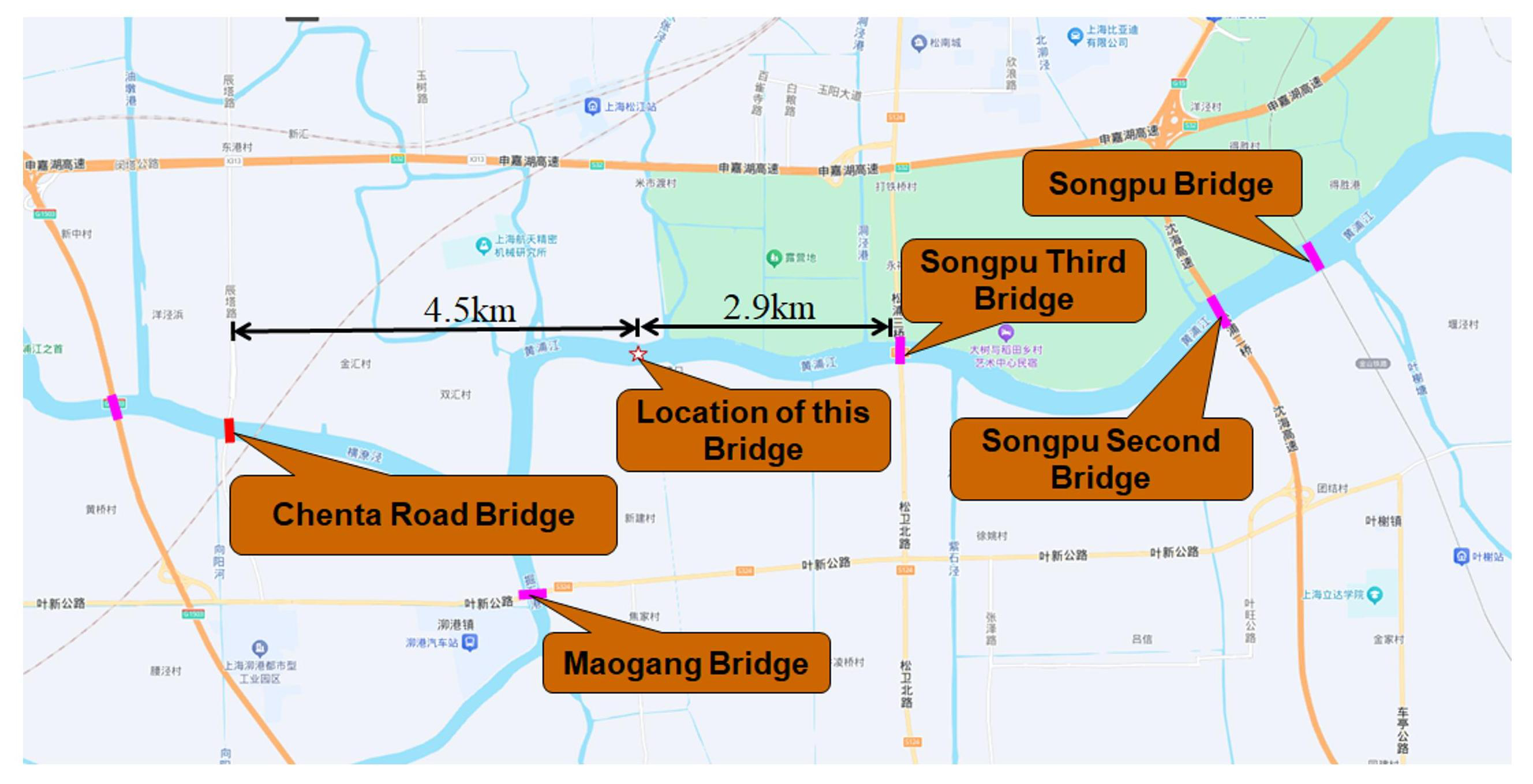 The project reviewed existing pedestrian and non-motorized vehicle crossing solutions at nearby river-crossing facilities. The Chenta Road Bridge over Hengliaojing, Songpu Third Bridge, and G320 Songpu Bridge all incorporate dedicated passages for pedestrians and non-motorized vehicles. However, these existing crossings are primarily located on the eastern and western sides of Songjiang New City, leaving a significant gap in service coverage. Within the project area, pedestrians and non-motorized vehicles would need to detour to the Songpu Third Bridge on Songwei Highway to the east (2.9 km straight-line distance) or the Chenta Road Bridge over Hengliaojing to the west (4.5 km straight-line distance) (Figure3) , resulting in substantial inconvenience for cross-river travel.