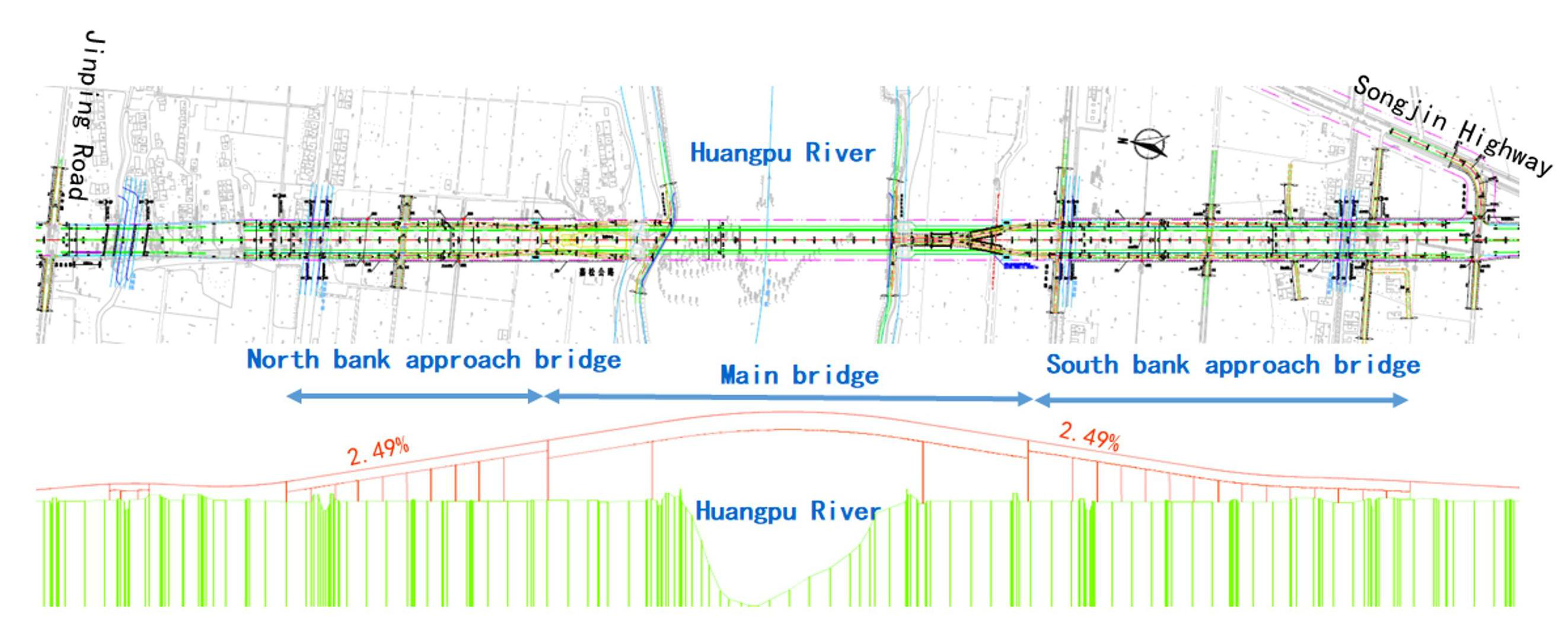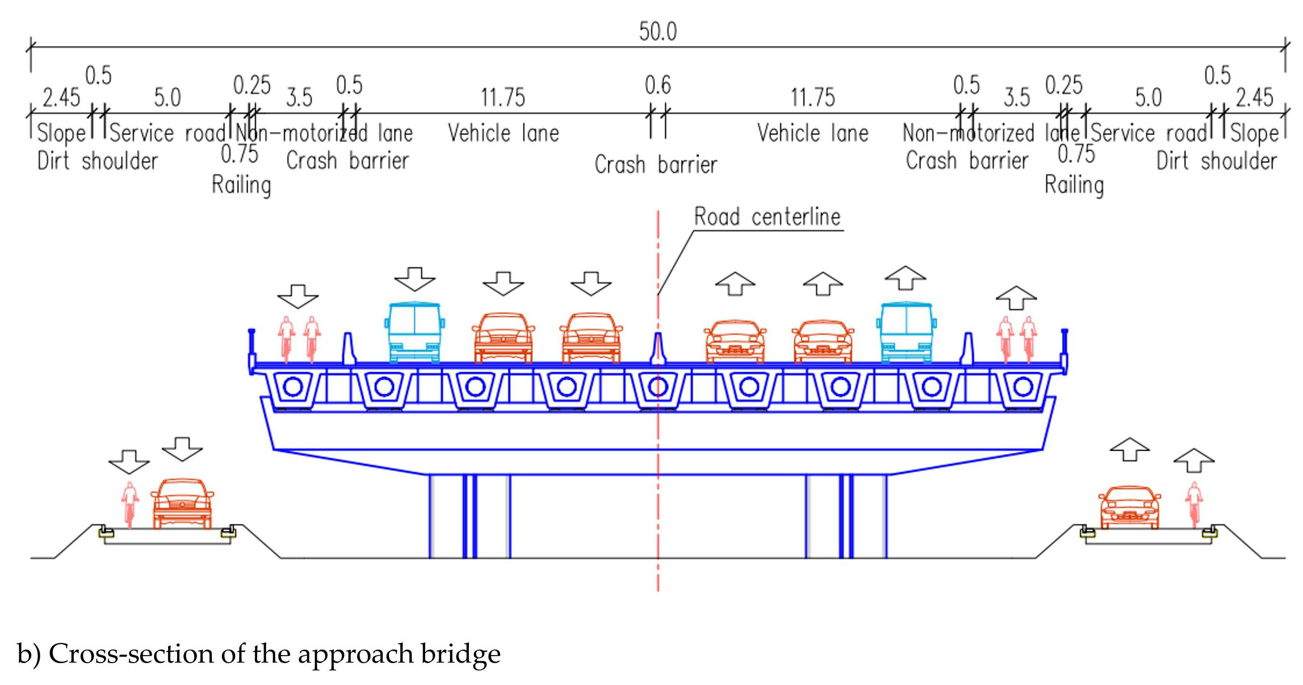 The Huangpu River-crossing bridge is designed with six vehicular lanes (bidirectional) + two non-motorized lanes on both sides, featuring a main bridge length of 596 m with a bidirectional2.49% vertical grade. The approach bridges span a total length of 857.8 m. Below-deck auxiliary roads accommodate two mixed-use lanes (bidirectional) for combined motorized, non-motorized, and pedestrian traffic [2]. The general layout of the bridge is shown in Figure4, while typical cross-sections of the main bridge and approach bridges are detailed in Figure5 a) and Figure5 b) , respectively.