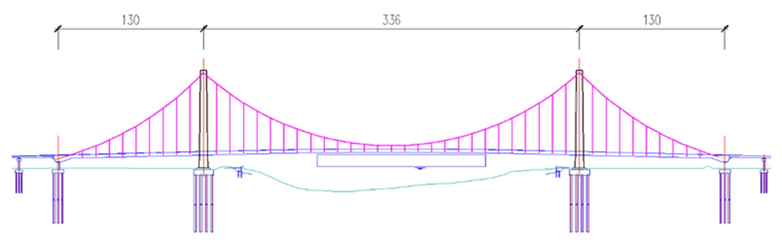 Based on previous engineering experience, the main bridge side span is 130 m, the middle span is 336 m, and the side-to-main span ratio is 1/2.58, which is within a reasonable range [5].