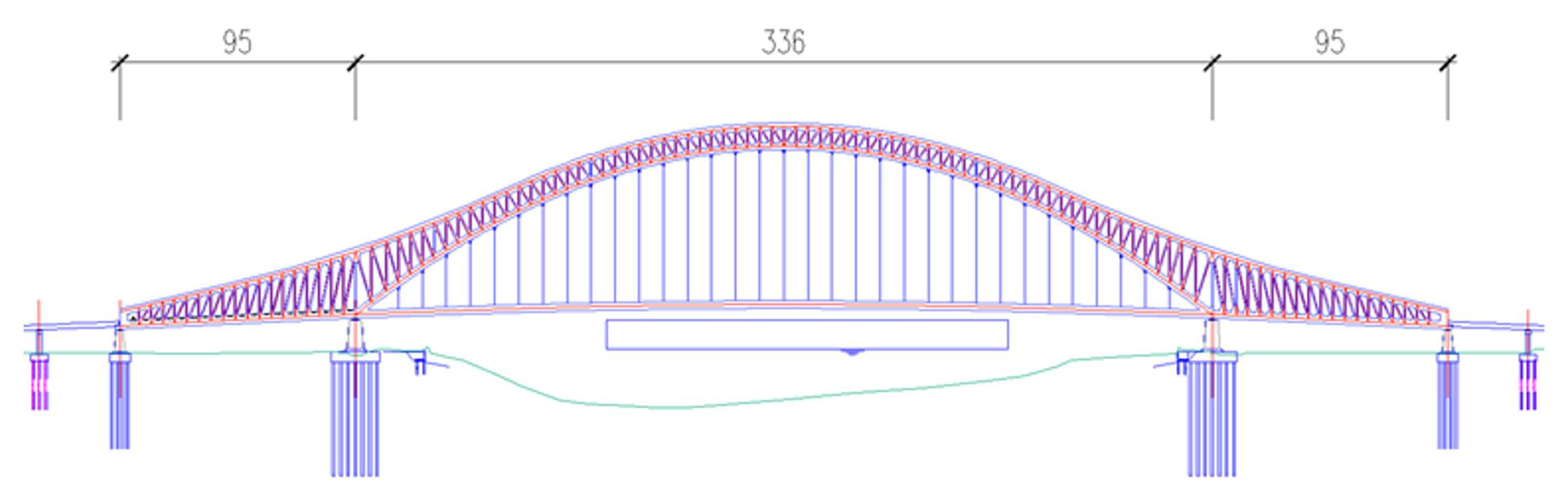 The main bridge features a336-m span lower-chord steel truss arch bridge, with a span arrangement of (95+336+95) m (Figure8) . The main bridge deck structure consists of steel tie beams, steel cross beams, small steel longitudinal beams, and reinforced concrete deck slabs. The width of the tie beams is the same as that of the steel truss arches, with steel transverse beams spaced at 4.5 m intervals. The steel tie beams, steel transverse beams, and longitudinal beams form the bridge deck grid beam system. Powerful horizontal stay cables are arranged between the transverse beams at both ends of the main bridge to balance the horizontal thrust caused by the dead and live loads on the main span arch ribs. The hangers arranged along the bridge axis are straight hangers spaced at 9 m intervals.