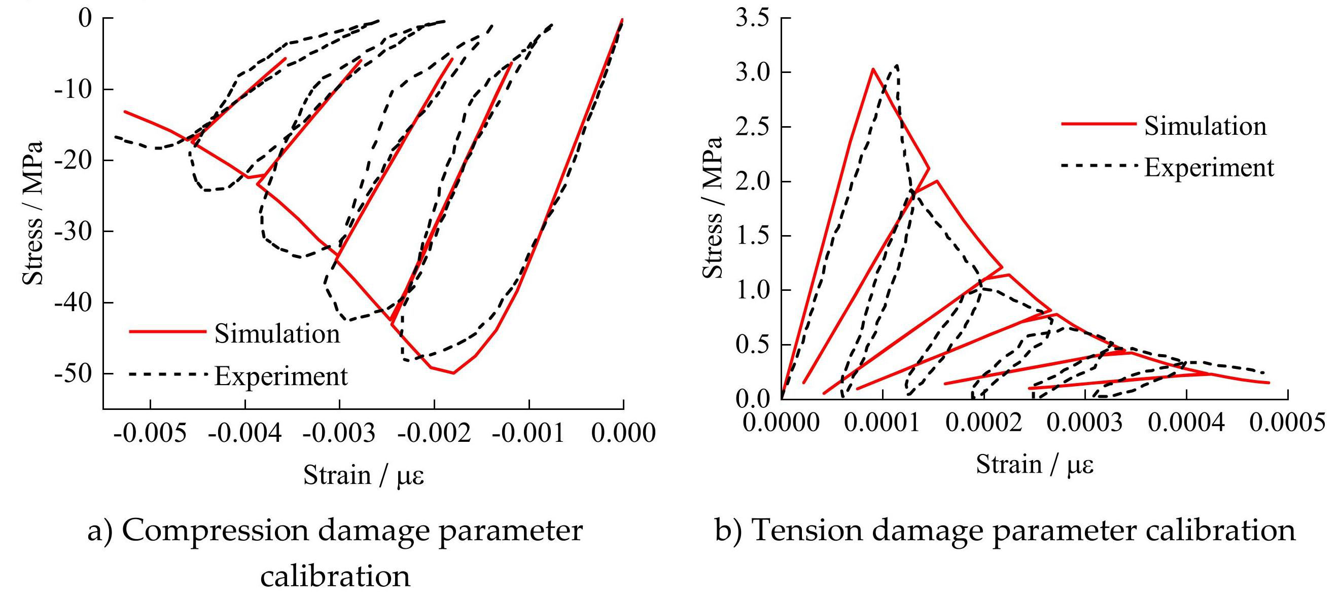 The plastic-damage microplane model was calibrated using the tensile and compressive test results from C50 concrete samples (Figure2) . In addition, the constitutive parameters for C50 concrete were determined in ANSYS Workbench (Table1) .