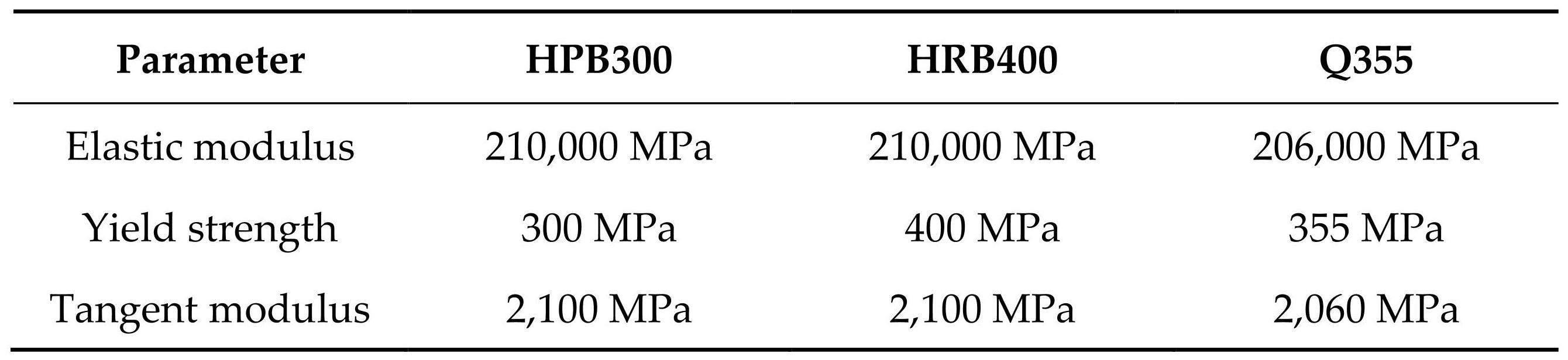 Reinforced steel is modeled using a bilinear elastic–plastic constitutive law with isotropic behavior in ANSYS Workbench. The material behavior follows the Von Mises Yield criterion, equivalent hardening criterion, and plastic flow criterion. After the reinforcement yields, the tangent modulus is set to 1/100 of the elastic modulus (Table2) .
