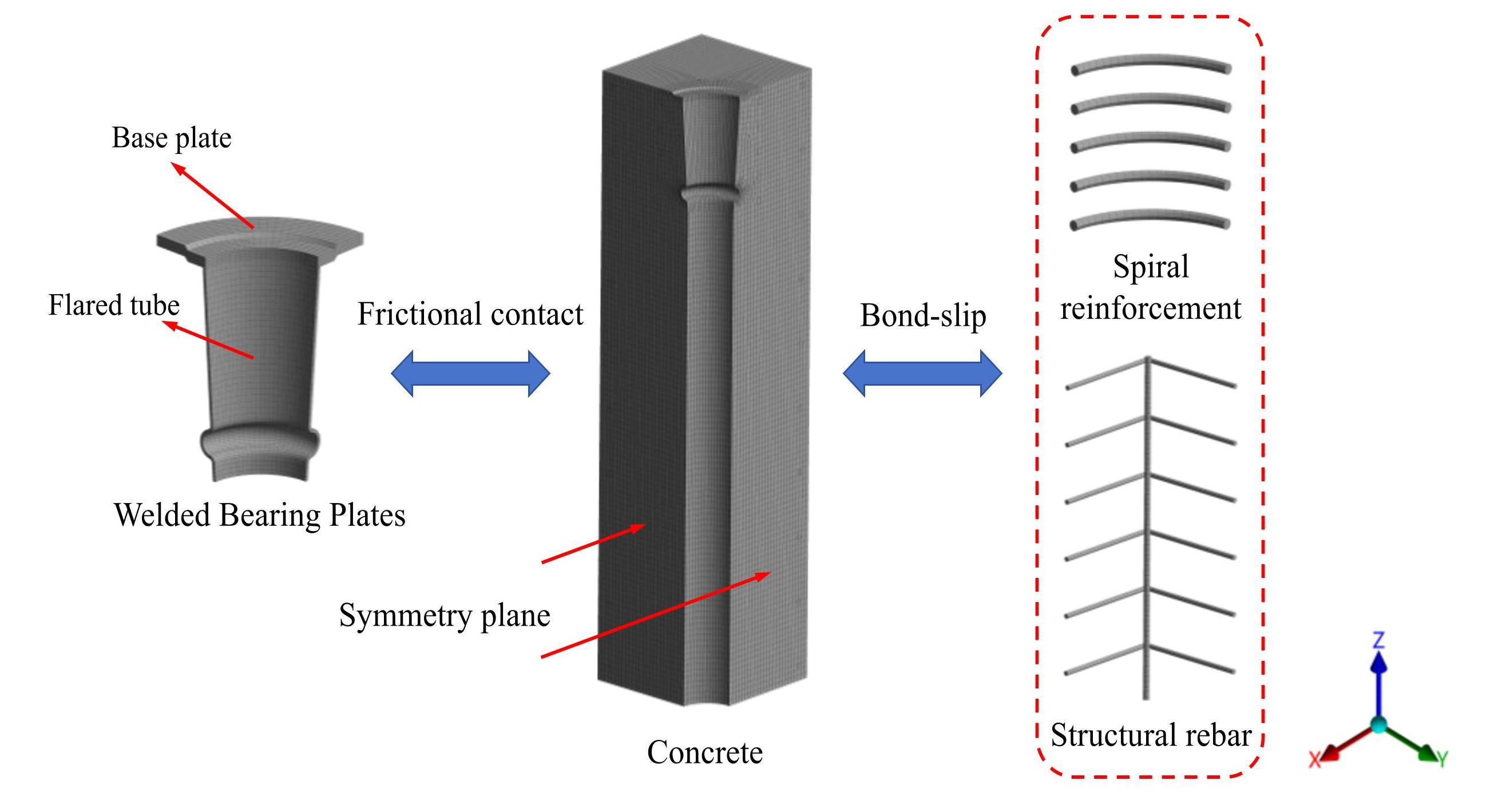 Symmetry boundary conditions are applied on the model’s symmetry plane to constrain the corresponding three degrees of freedom, whereas the degrees of freedom for displacement in the bottom X, Y, and Z directions remain fixed at zero. The bond and slip between the spiral reinforcement, stirrups and the concrete are simulated using specific connection elements to ensure that no over constraint occurs. Additionally, “friction” contact is adopted between the anchorage plate and the concrete, with a friction coefficient of 0.2.