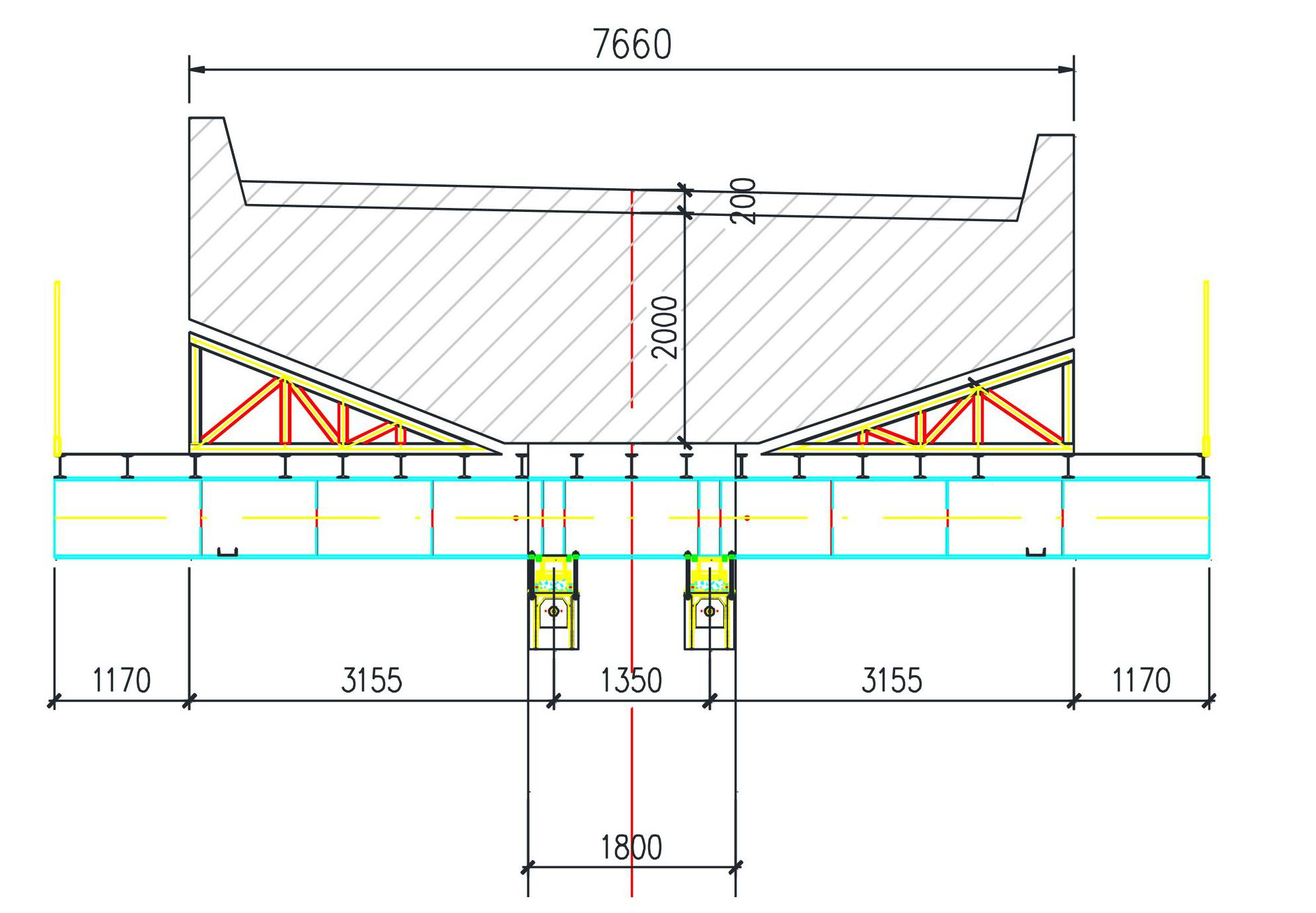 The support distribution beams employ I22A I-beams with a length of 6 m and a spacing of 500 mm. The central portion of the beams carries the load from the bent cap, while the sections on both sides, corresponding to access walkways, bear the construction live load. The maximum depth of the bent cap concrete is taken as 2.2 m.