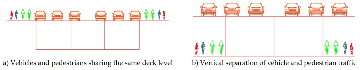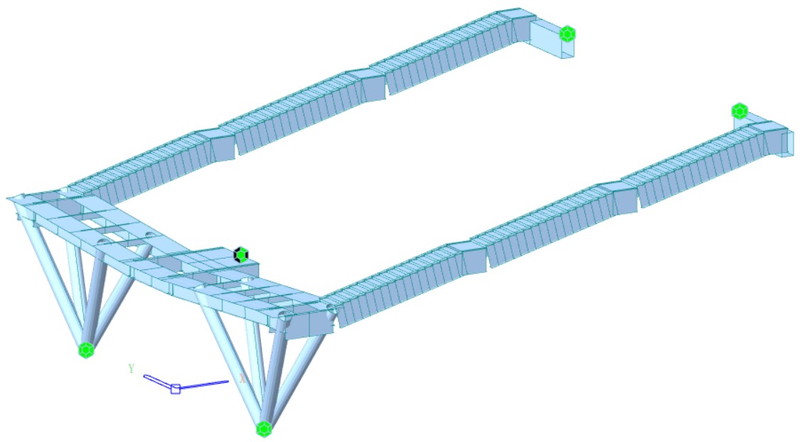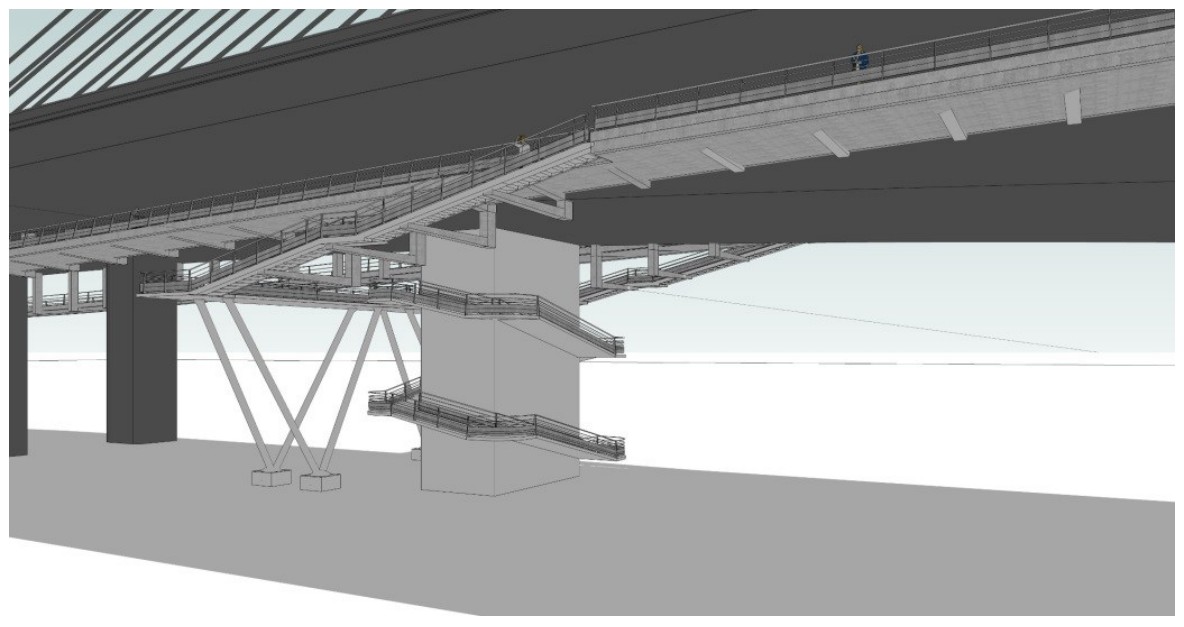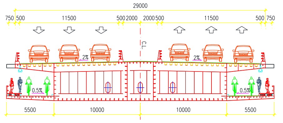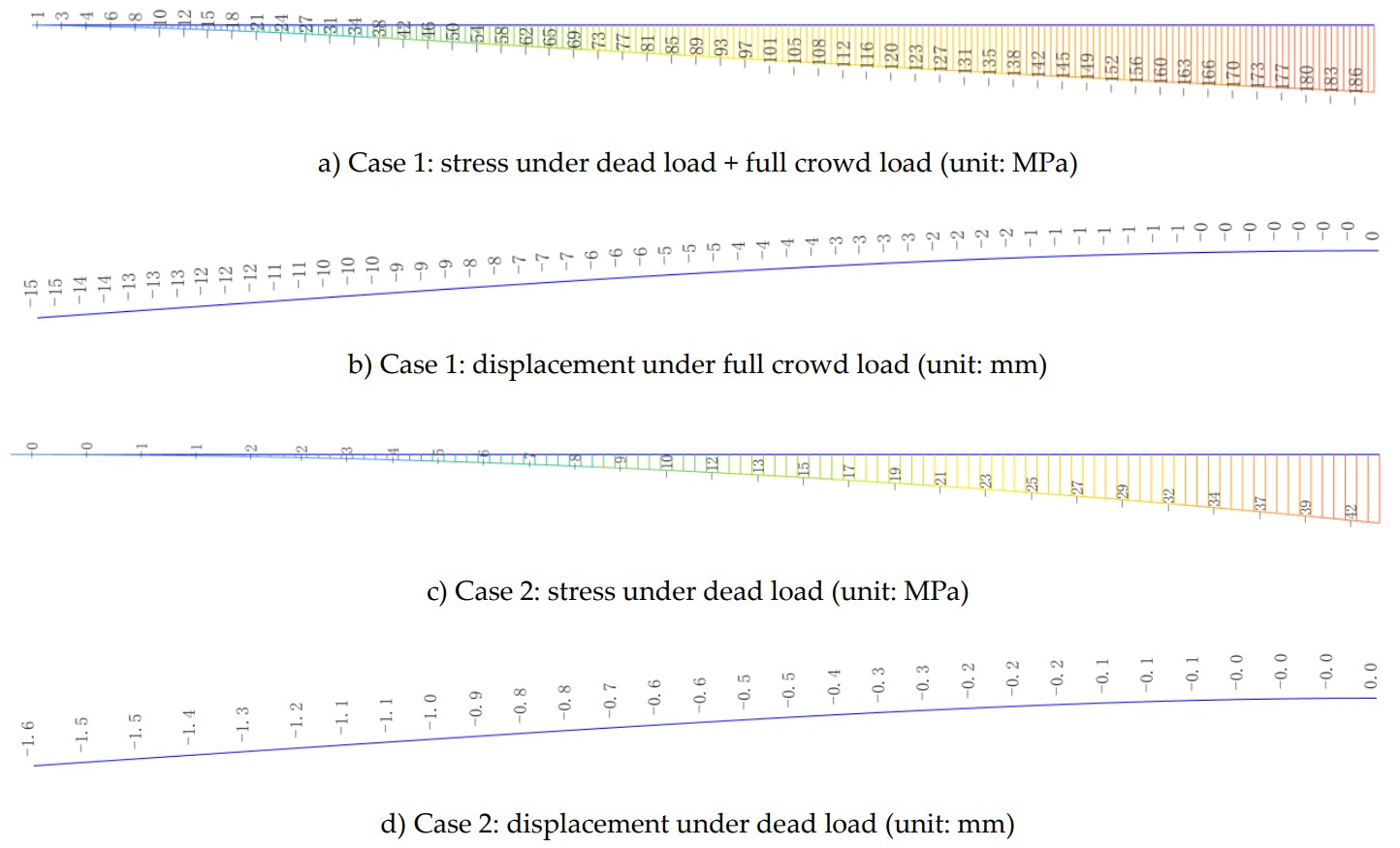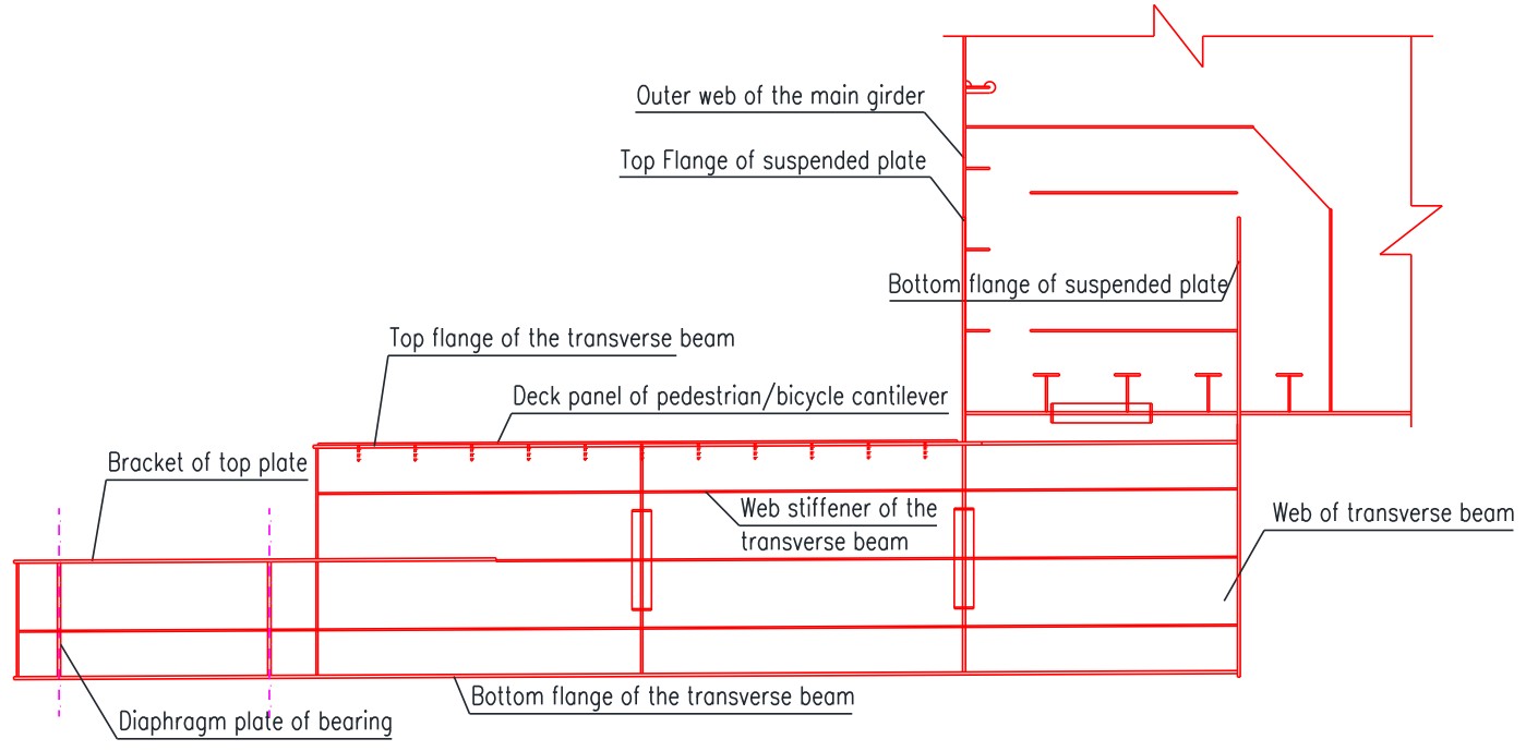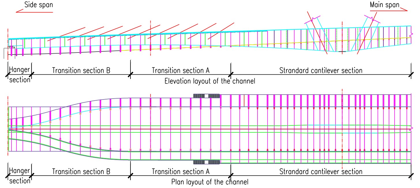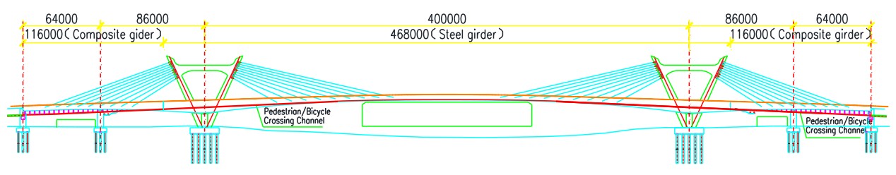 Abstract:The main bridge of the Zhongxing Bridge is a hybrid girder extradosed cable-stayed bridge with a span arrangement of (64+86) m + 400 m + (86+64) m. A pedestrian and nonmotorized vehicle (hereafter referred to as a “pedestrian/bicycle”) crossing channel is designed to traverse the river along the main bridge. In this paper, the design scheme of this pedestrian/bicycle channel is investigated in terms of structural mechanics, structural detailing, economy, and maintenance. The design scheme features a vertical separation of vehicle and pedestrian/bicycle traffic, in which the pedestrian/bicycle system is located outside the webs of the box girder. To decouple the structural connection between the main bridge and the pedestrian/bicycle channel, thereby reducing the effect of the main bridge forces on the channel structure, longitudinal and transverse expansion joints were installed and the installation sequence of the channel was optimized. A computational analysis was performed using the finite element software Midas Civil. The results indicate that the previously mentioned methods can significantly reduce structural stress. Furthermore, analyses of pedestrian comfort and the structural performance of the pedestrian staircase were conducted. The results indicate that this pedestrian/bicycle channel can satisfy both static and dynamic requirements.