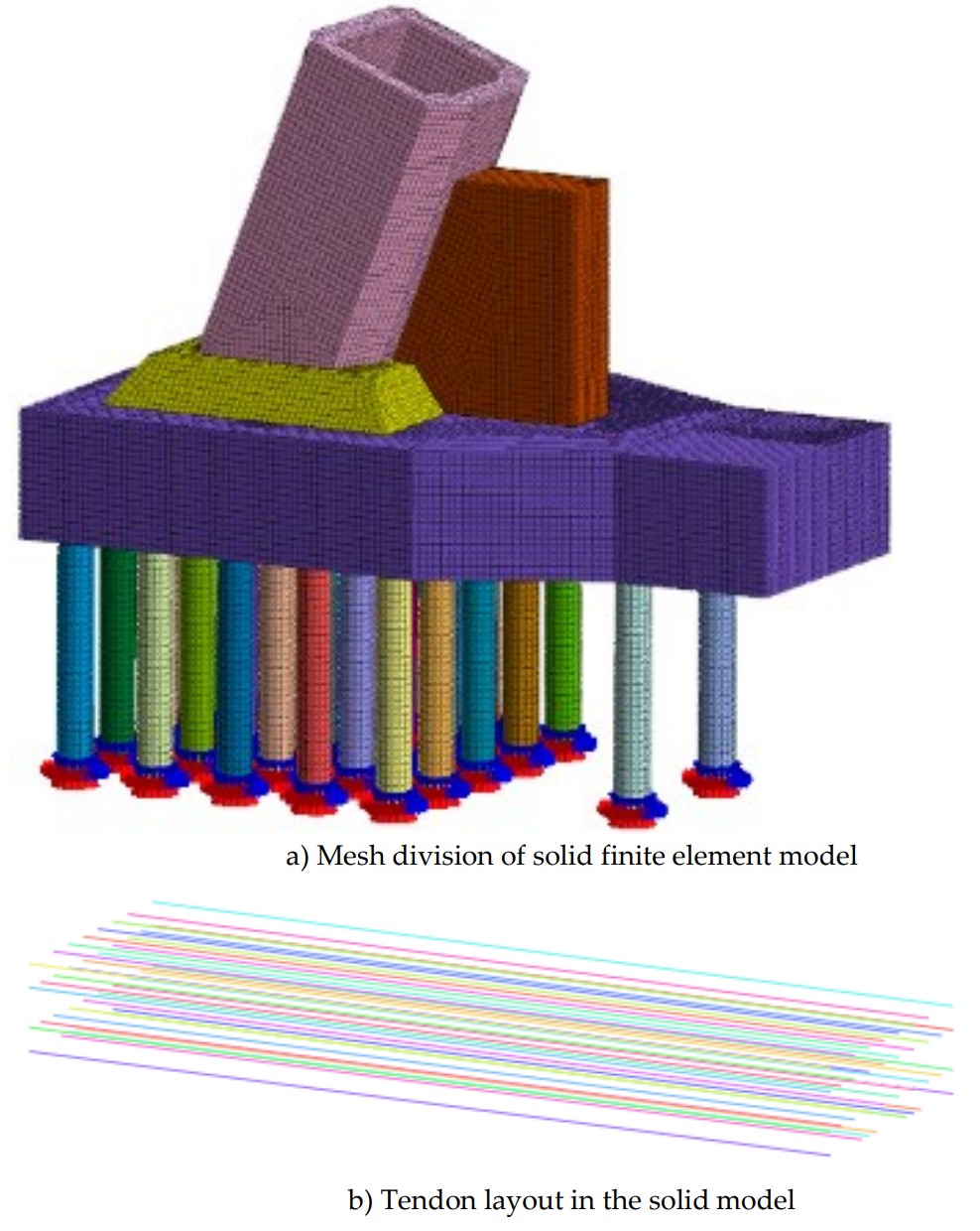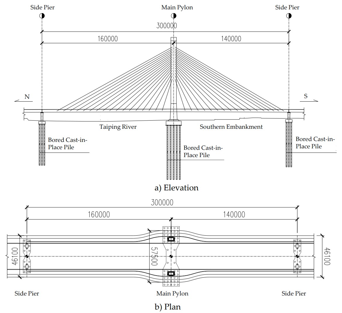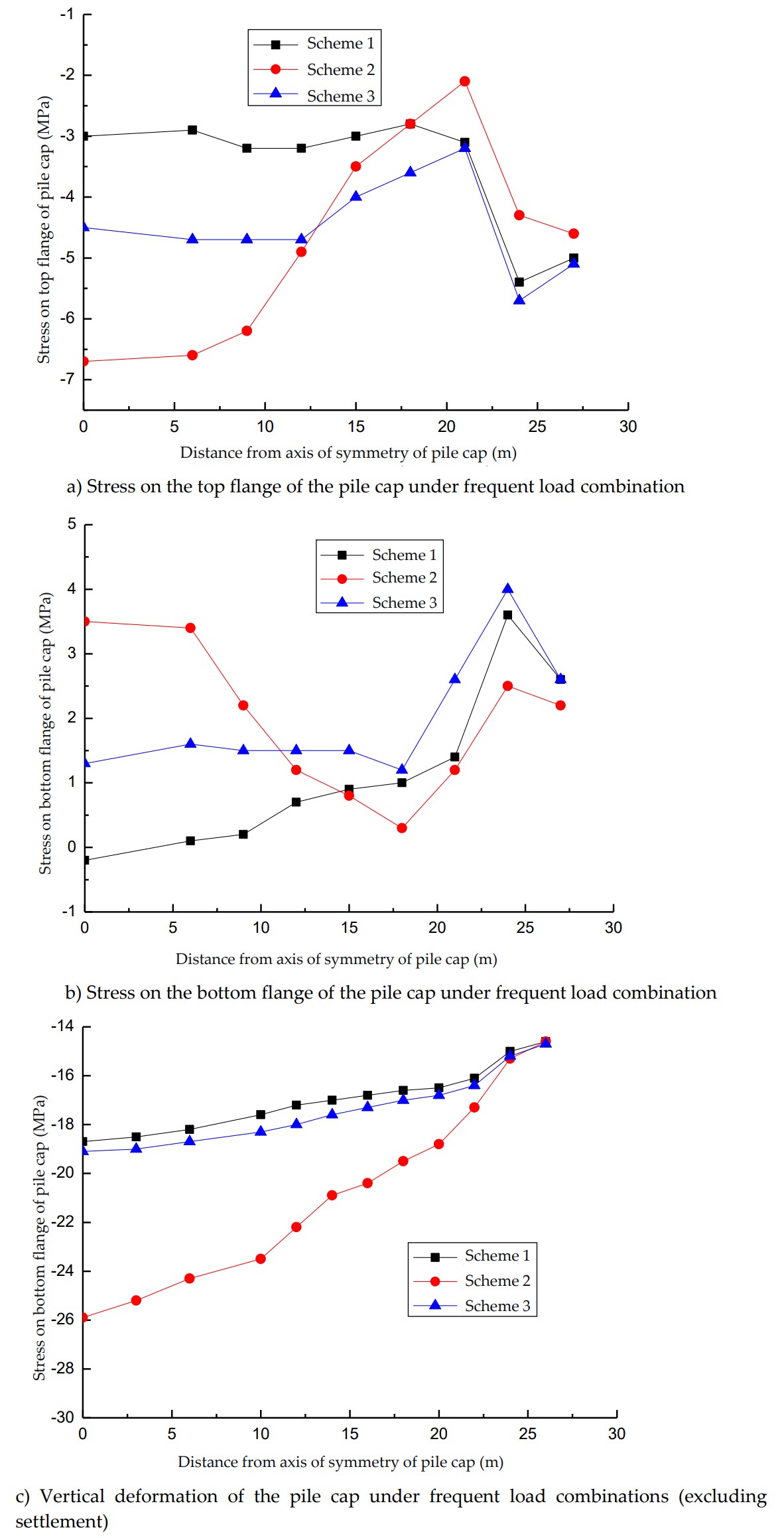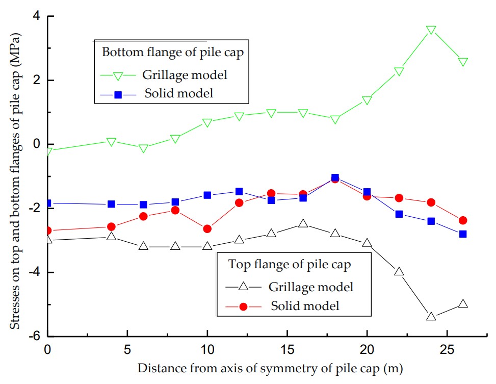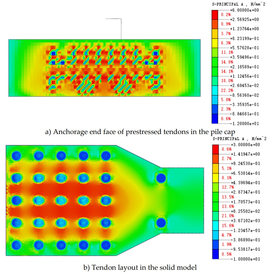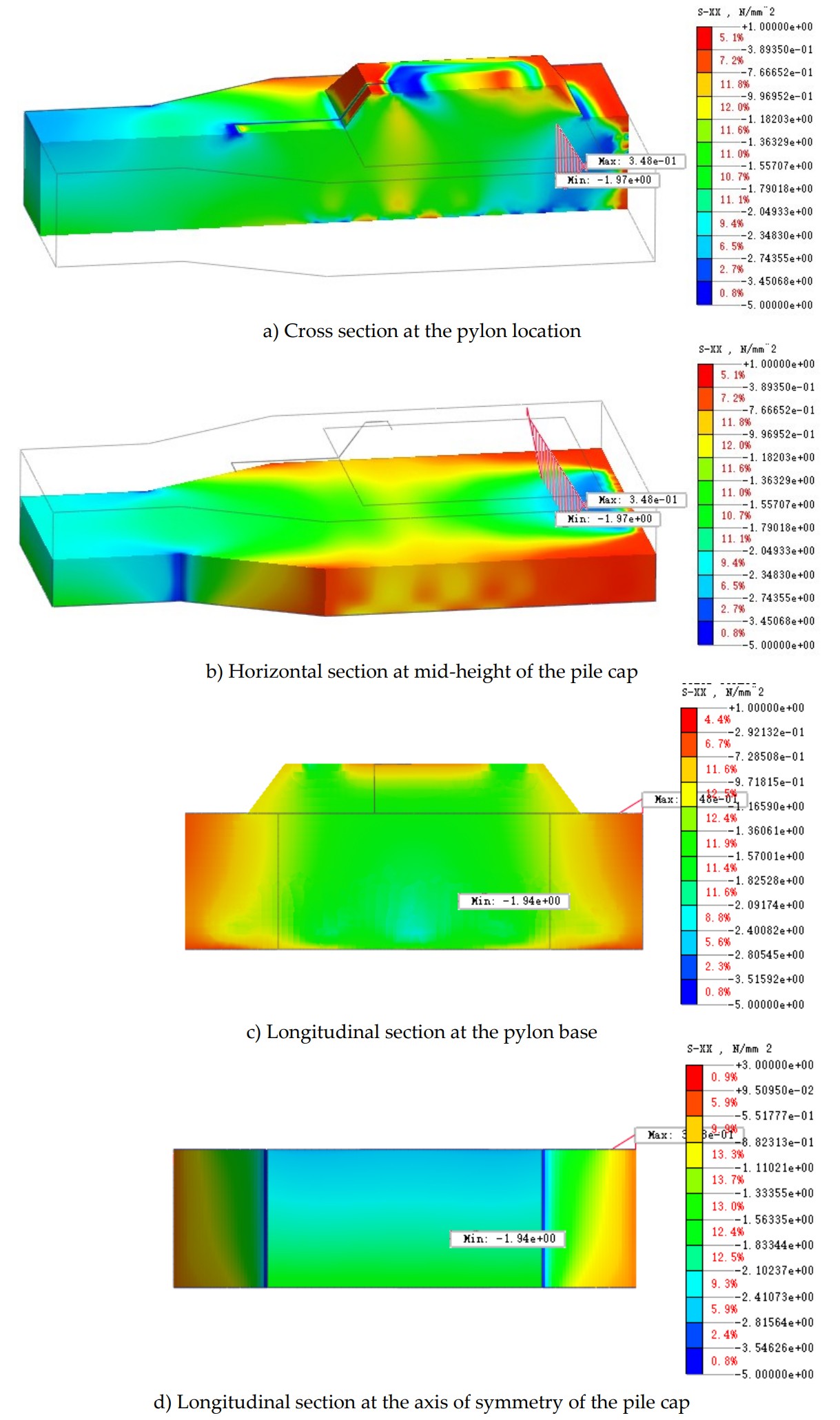 Abstract:To investigate the mechanical behavior of the pile cap for the main pylon of an A-shaped cable-stayed bridge without crossbeams, a realistic bridge of this type was selected as a case study. A grillage finite element model of the entire bridge was established using MIDAS to compare and analyze the effects of three different pile foundation layout schemes on the mechanical response of the pile cap. Subsequently, a local solid model of the pile cap was developed using MIDAS FEA NX to examine its transverse stress distribution under frequent load combinations. The results of comparison and selection revealed that the optimal scheme involves symmetrically arranging “2+2” piles at the dumbbell-shaped necking region in the center of the pile cap. This configuration effectively reduces the span, resulting in a more uniform and reasonable distribution of stress and deformation in the pile cap under frequent load combinations. The load-bearing mechanism of the pile cap is characterized by transverse prestressed steel tendons acting as key “balancing elements”. By establishing a prestress field within the pile cap, these tendons directly resist the horizontal thrust generated by the pylon, working together with the passive pile foundation to form a three-dimensional load-bearing system that internally balances, spatially distributes, and transfers the complex spatial forces from the superstructure. In addition, reinforcement meshes should be arranged in the prestress anchorage zones and in the regions between piles at the bottom of the pile cap to resist local tensile stress concentrations and control cracking. Traditional spatial grillage models exhibit limitations in analyzing the mechanical behavior of the thick and large pile caps in such A-shaped pylons, which may lead to distorted results and overestimation of local stresses. Therefore, the use of solid finite element models is recommended for accurate verification and design.