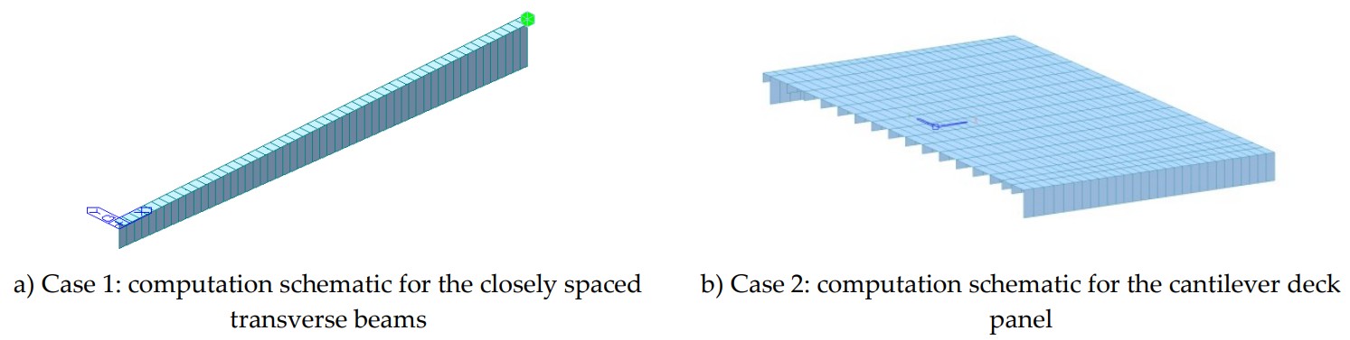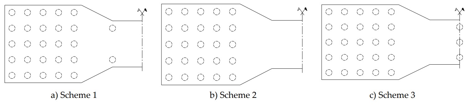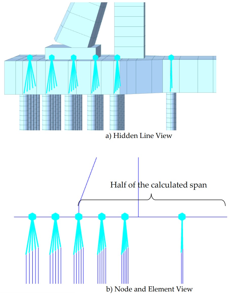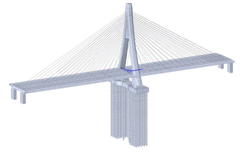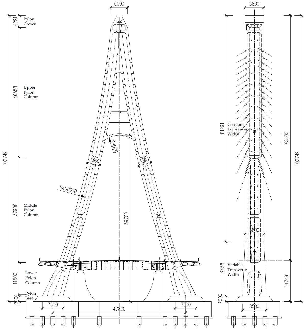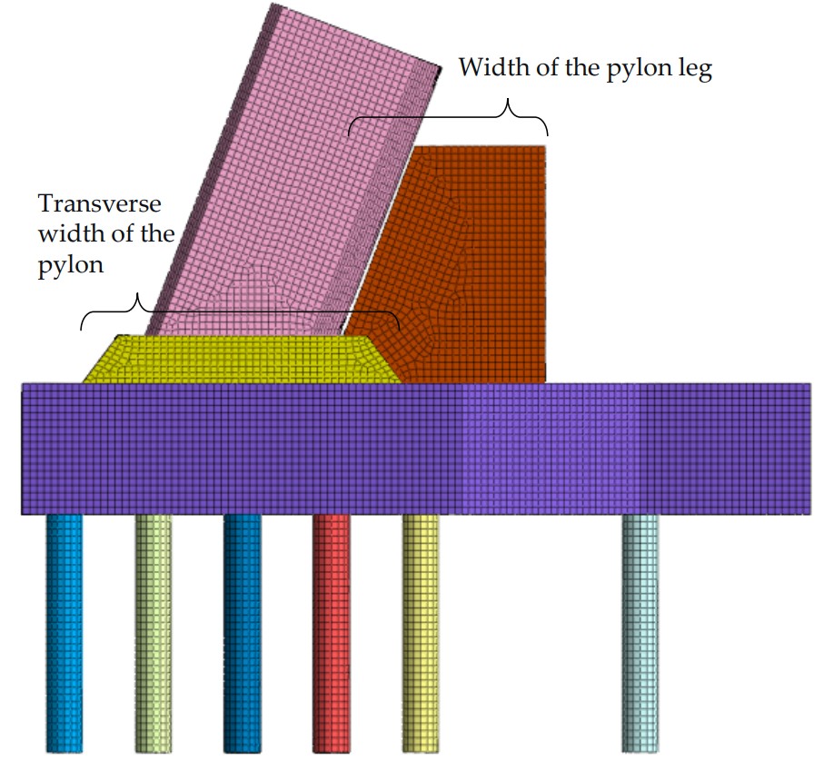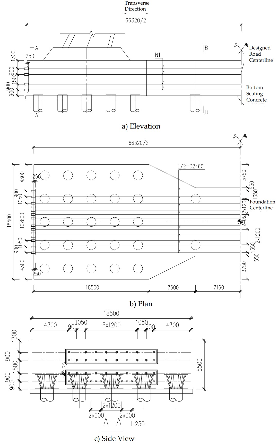 Abstract:To investigate the mechanical behavior of the pile cap for the main pylon of an A-shaped cable-stayed bridge without crossbeams, a realistic bridge of this type was selected as a case study. A grillage finite element model of the entire bridge was established using MIDAS to compare and analyze the effects of three different pile foundation layout schemes on the mechanical response of the pile cap. Subsequently, a local solid model of the pile cap was developed using MIDAS FEA NX to examine its transverse stress distribution under frequent load combinations. The results of comparison and selection revealed that the optimal scheme involves symmetrically arranging “2+2” piles at the dumbbell-shaped necking region in the center of the pile cap. This configuration effectively reduces the span, resulting in a more uniform and reasonable distribution of stress and deformation in the pile cap under frequent load combinations. The load-bearing mechanism of the pile cap is characterized by transverse prestressed steel tendons acting as key “balancing elements”. By establishing a prestress field within the pile cap, these tendons directly resist the horizontal thrust generated by the pylon, working together with the passive pile foundation to form a three-dimensional load-bearing system that internally balances, spatially distributes, and transfers the complex spatial forces from the superstructure. In addition, reinforcement meshes should be arranged in the prestress anchorage zones and in the regions between piles at the bottom of the pile cap to resist local tensile stress concentrations and control cracking. Traditional spatial grillage models exhibit limitations in analyzing the mechanical behavior of the thick and large pile caps in such A-shaped pylons, which may lead to distorted results and overestimation of local stresses. Therefore, the use of solid finite element models is recommended for accurate verification and design.