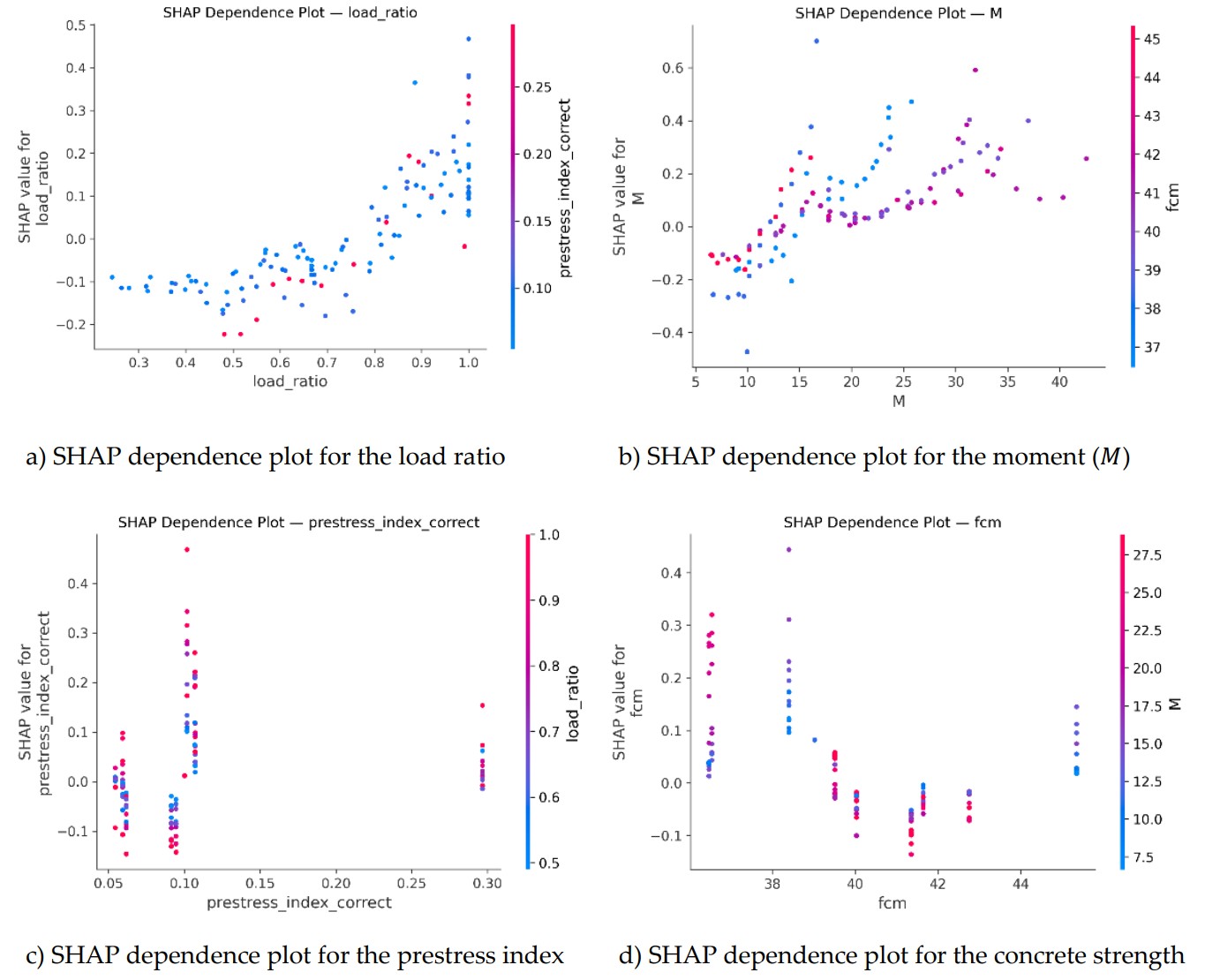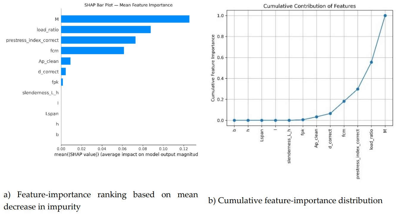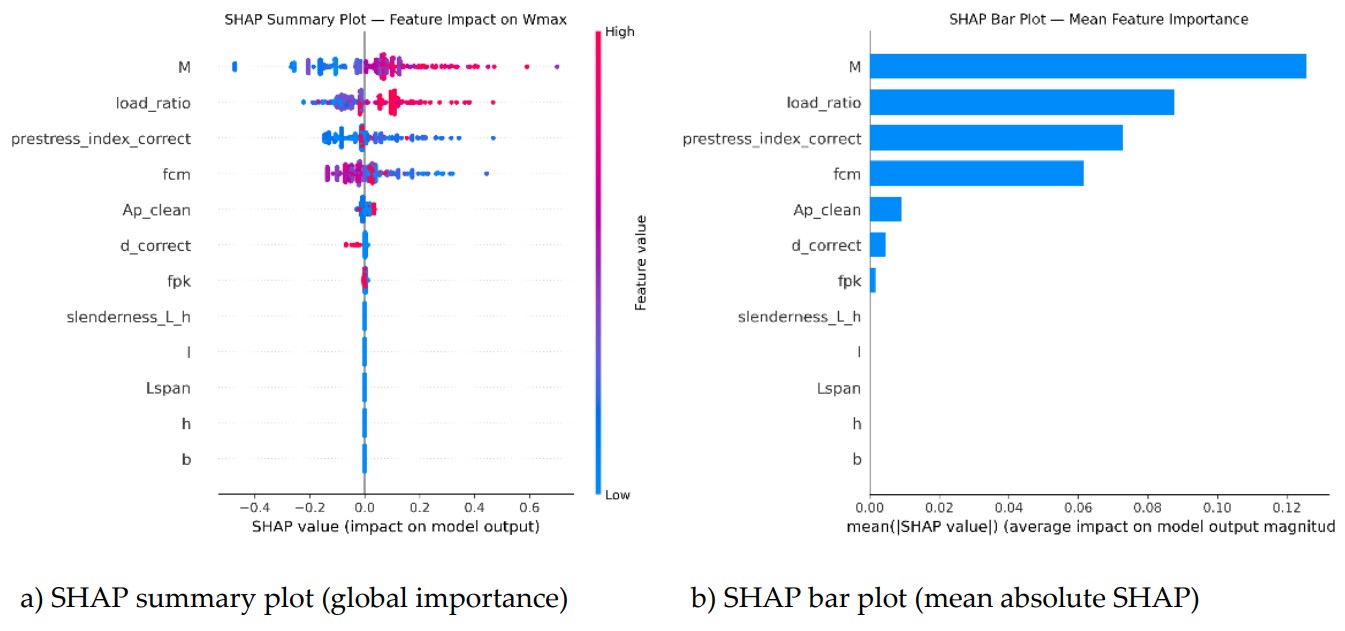 Abstract:Accurate prediction of crack width is essential for serviceability design and durability assessments of prestressed concrete structures. This study presents an explainable machine learning framework for predicting the maximum crack width of prestressed concrete beams based on experimental data. A comprehensive database of 404 specimens, including the bending moment, prestress index, load ratio, effective depth, and section stiffness, was constructed and enhanced through mechanically informed feature engineering. Random forest and XGBoost regression models were developed and systematically tuned using cross-validated hyperparameter optimization. Among the evaluated models, XGBoost achieved the highest predictive accuracy, with a coefficient of determination of 0.6507 and a root mean square error of 0.184 mm. Model interpretability was investigated using feature importance measures and SHapley Additive exPlanations, which identified the bending moment, load ratio, concrete compressive strength, and prestress index as the dominant factors influencing crack width. The observed relationships are consistent with the established flexural cracking theory, confirming that the proposed model captures physically meaningful behavior. The results demonstrate that combining explainable artificial intelligence with structural mechanics provides a robust and transparent tool for crack width prediction, offering valuable support for the performance-based evaluation and design of prestressed concrete members.