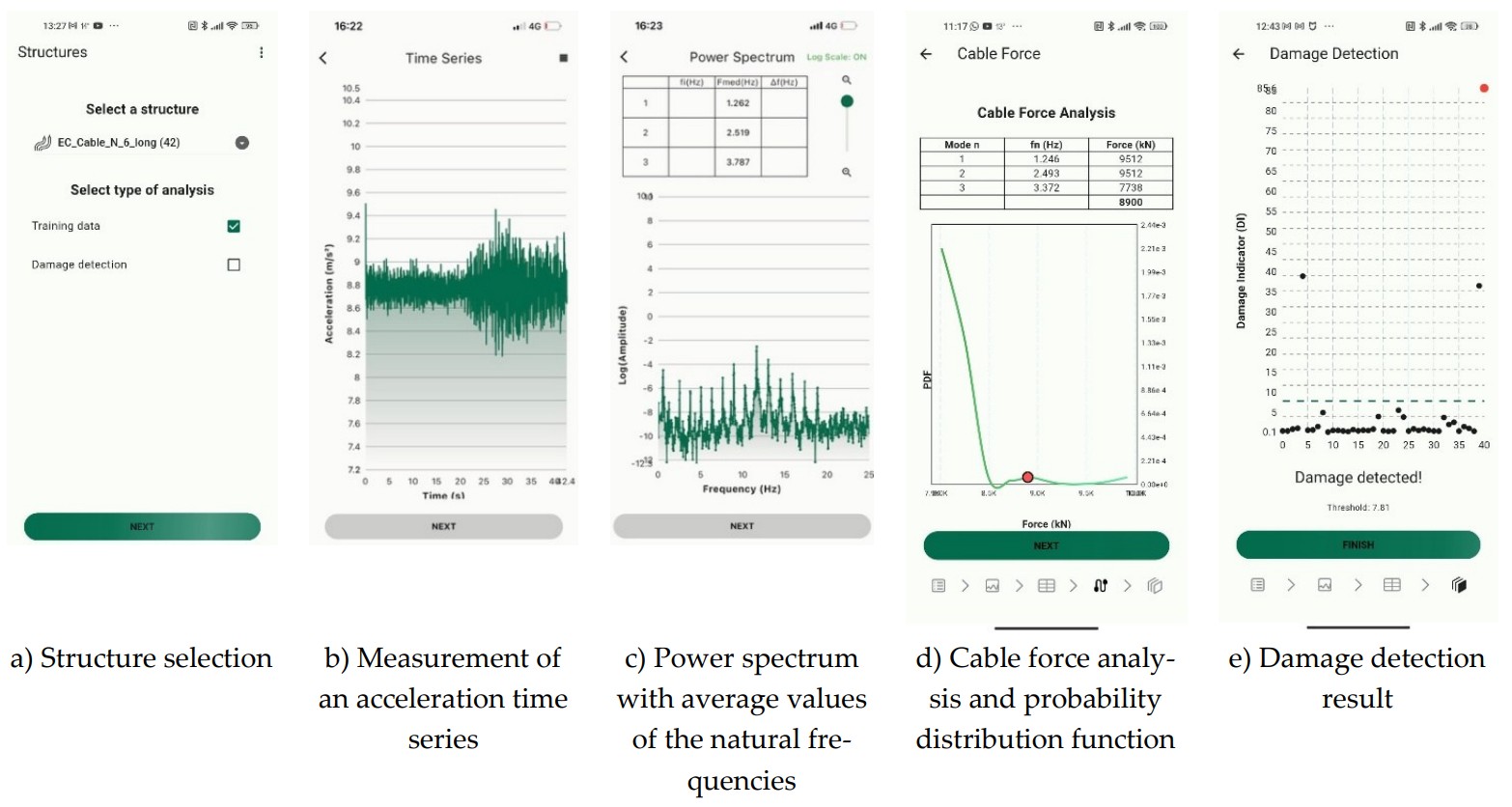 Abstract:App4SHM is a mobile system for structural health monitoring (SHM) of bridges that aims to support routine inspections. It consists of a front-end smartphone application that is used to measure natural frequencies of vibration and to detect damage supported by a backstage server software, accessible through any internet browser. This paper focuses on the new module for stay cables, which directly converts natural frequencies into cable tension forces based on the cable's material and geometrical characteristics. The conversion uses an estimate of the forces from the taut string theory. Regardless of the module, App4SHM works in two modes. The training mode is used to collect observations composed of natural frequencies under normal operational and environmental conditions. The observations are used to train an unsupervised machine learning algorithm to learn the structure's normal behavior. The damage detection mode collects unlabeled observations, which are tested against normal behavior to detect abnormal performance that may be indicative of damage or excessive tension. The Edgar Cardoso Bridge — a large cable-stayed bridge in Portugal, undergoing rehabilitation and stay cables replacement — is used as a case study for the measurement of cable tension forces.